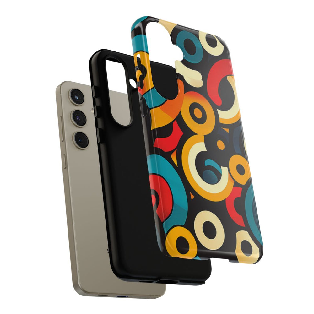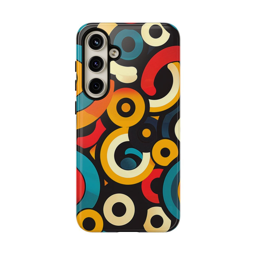 Dit telefoonhoesje heeft een abstract patroon van overlappende cirkels en bogen in levendige kleuren zoals teal, rood, geel, crème en zwart. De vormen verschillen in grootte en zorgen voor een dynamisch, gelaagd effect op een donkere achtergrond. Het ontwerp is modern en geometrisch, met vloeiende kleurverlopen en opvallende contrasten. Het hoesje is glanzend afgewerkt en bestaat uit een stevige dubbele laag van een polycarbonaat buitenkant en een TPU binnenzijde, waardoor het extra duurzaam is en optimale bescherming biedt. Het hoesje ondersteunt draadloos opladen en is bestand tegen invloeden van buitenaf.