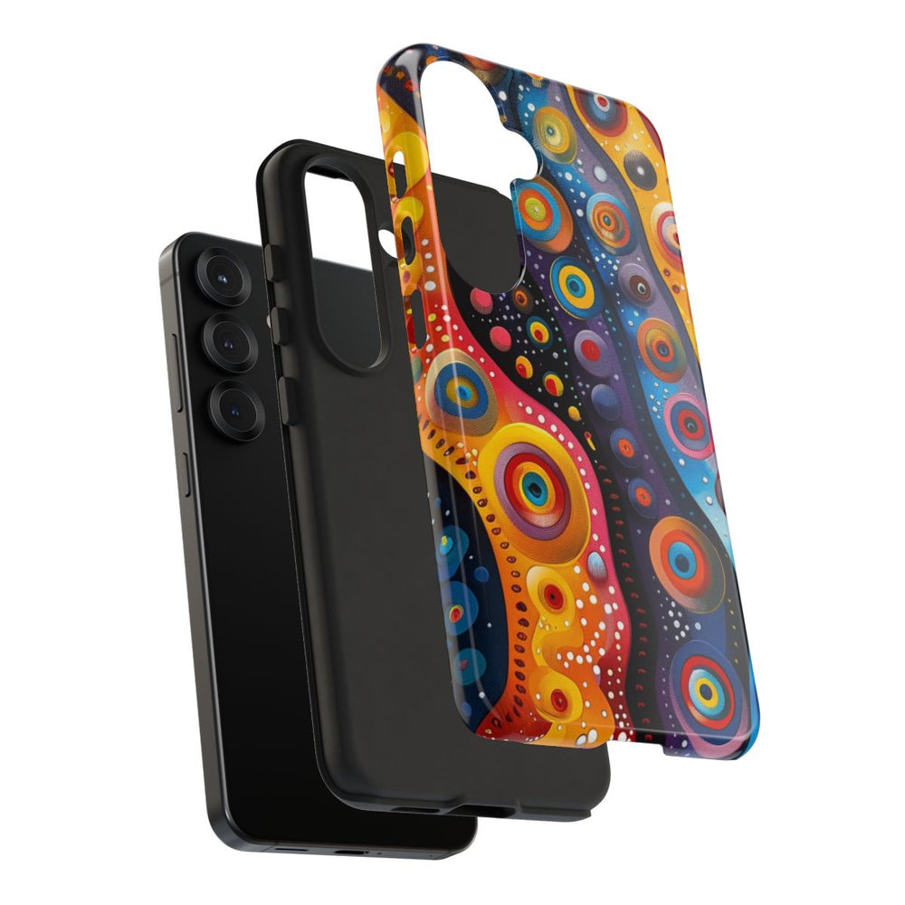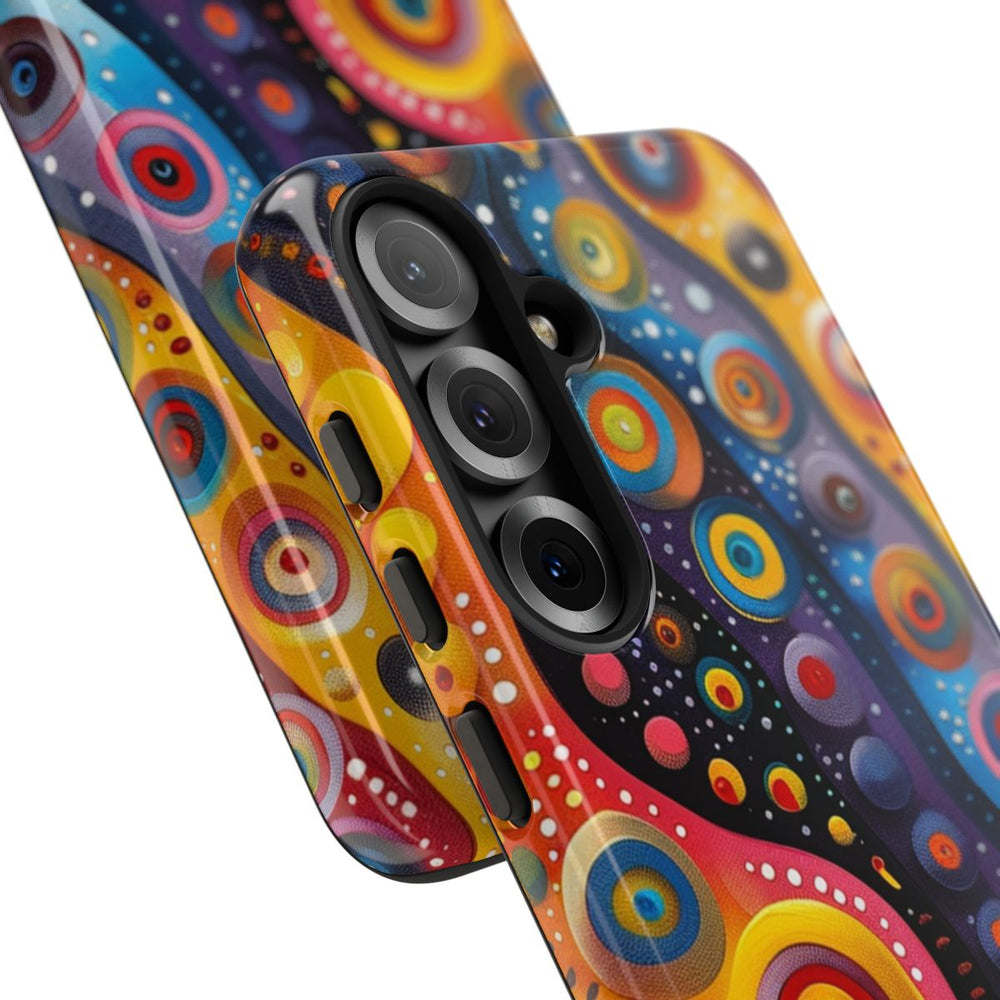 Dit hoesje is voorzien van een opvallend abstract patroon met talloze concentrische cirkels in verschillende formaten en kleuren. De cirkels zijn gerangschikt langs golvende banen die afwisselen in tinten blauw, geel, rood, paars en zwart. Kleine witte en gekleurde stippen zorgen voor extra accenten en geven het geheel een dynamische en levendige uitstraling. De afbeelding is gedrukt op een glanzend stevig hoesje met een polycarbonaat buitenkant en een TPU binnenzijde, wat zorgt voor dubbele bescherming en ondersteuning van draadloos opladen.