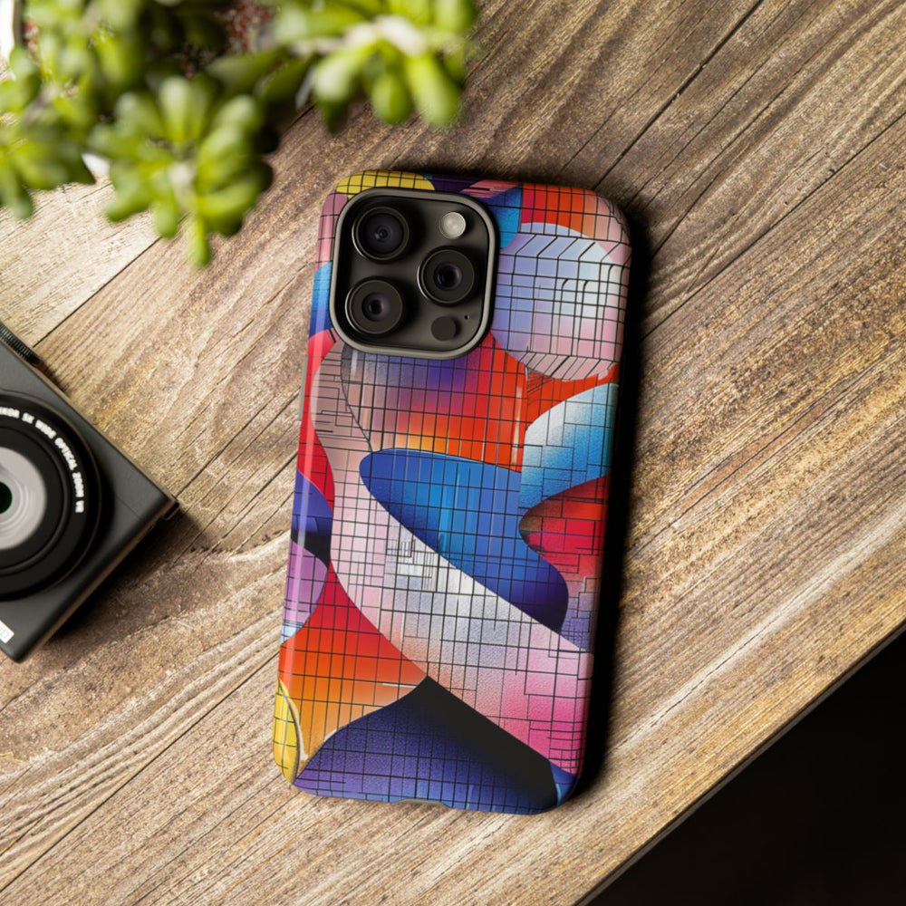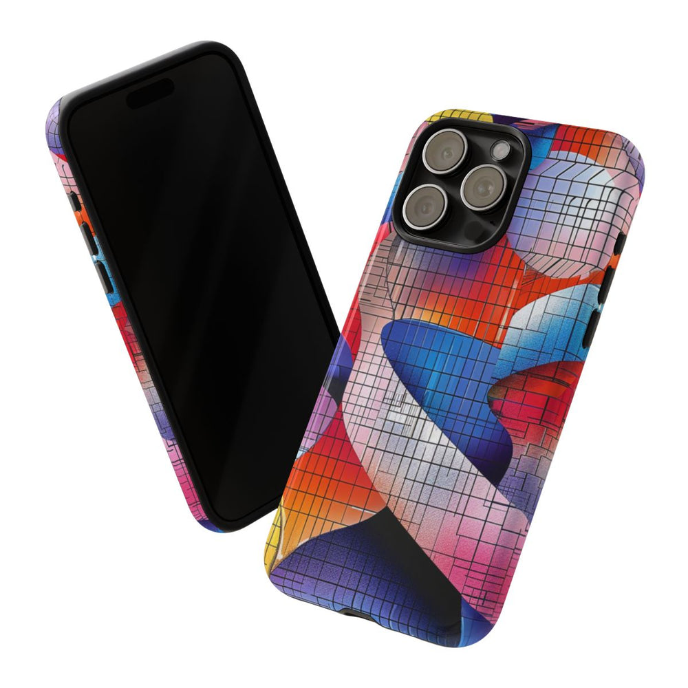 Dit hoesje heeft een abstract ontwerp met in elkaar verweven dubbele helixvormen in levendige kleuren zoals blauw, rood, roze, oranje, geel en paars. Over het ontwerp ligt een rasterpatroon van zwarte lijnen, wat zorgt voor een geometrische en moderne uitstraling. Het hoesje is glanzend afgewerkt en bestaat uit een stevige dubbele laag met een polycarbonaat buitenkant en een TPU-binnenzijde, wat zorgt voor duurzaamheid en optimale bescherming. Geschikt voor draadloos opladen en uitstekend bestand tegen verschillende weersomstandigheden.