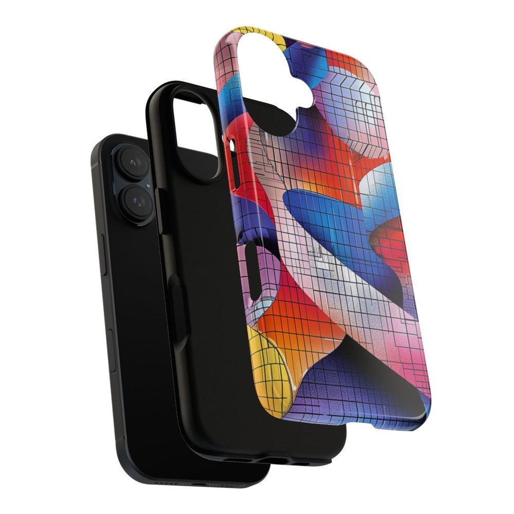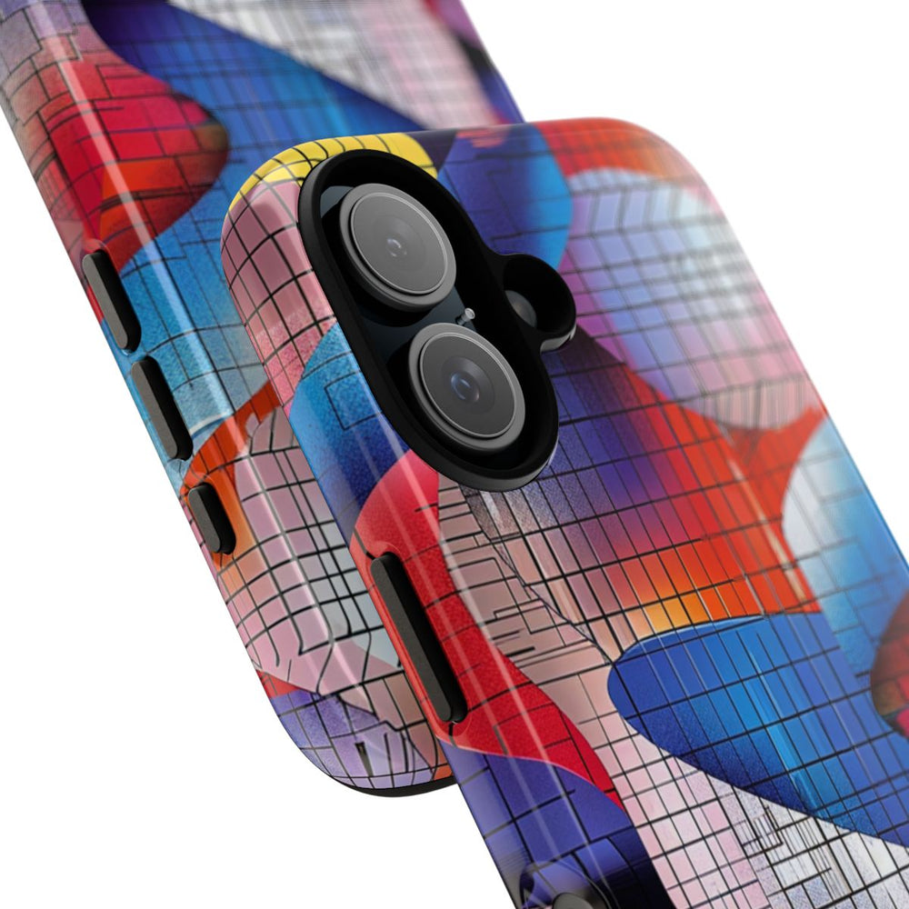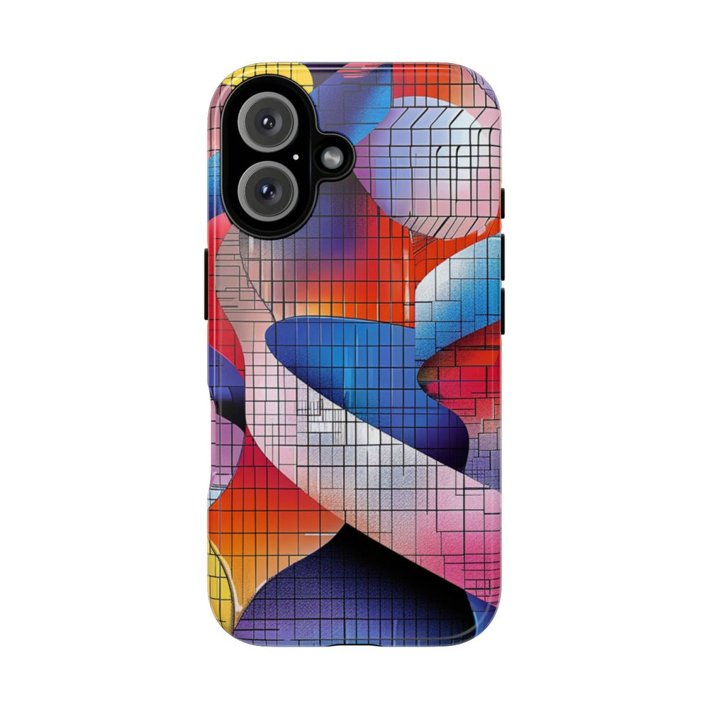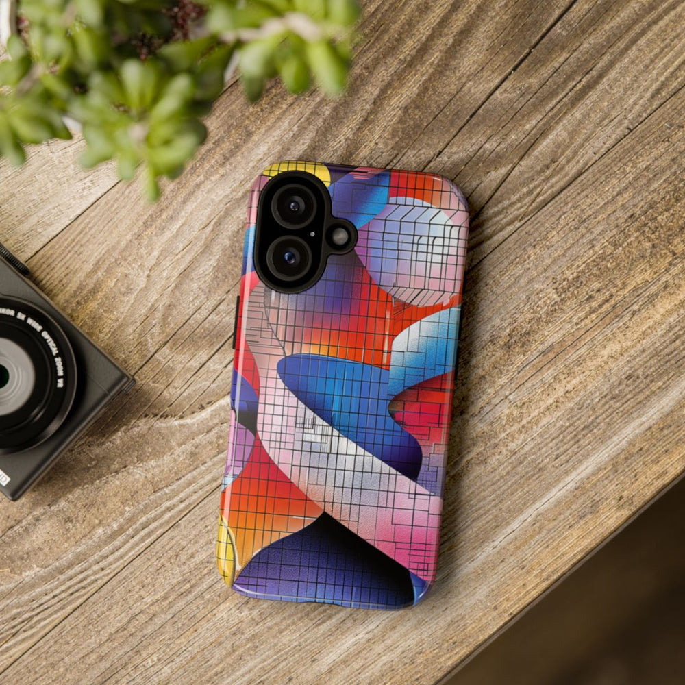 Dit hoesje heeft een abstract ontwerp met in elkaar verweven dubbele helixvormen in levendige kleuren zoals blauw, rood, roze, oranje, geel en paars. Over het ontwerp ligt een rasterpatroon van zwarte lijnen, wat zorgt voor een geometrische en moderne uitstraling. Het hoesje is glanzend afgewerkt en bestaat uit een stevige dubbele laag met een polycarbonaat buitenkant en een TPU-binnenzijde, wat zorgt voor duurzaamheid en optimale bescherming. Geschikt voor draadloos opladen en uitstekend bestand tegen verschillende weersomstandigheden.