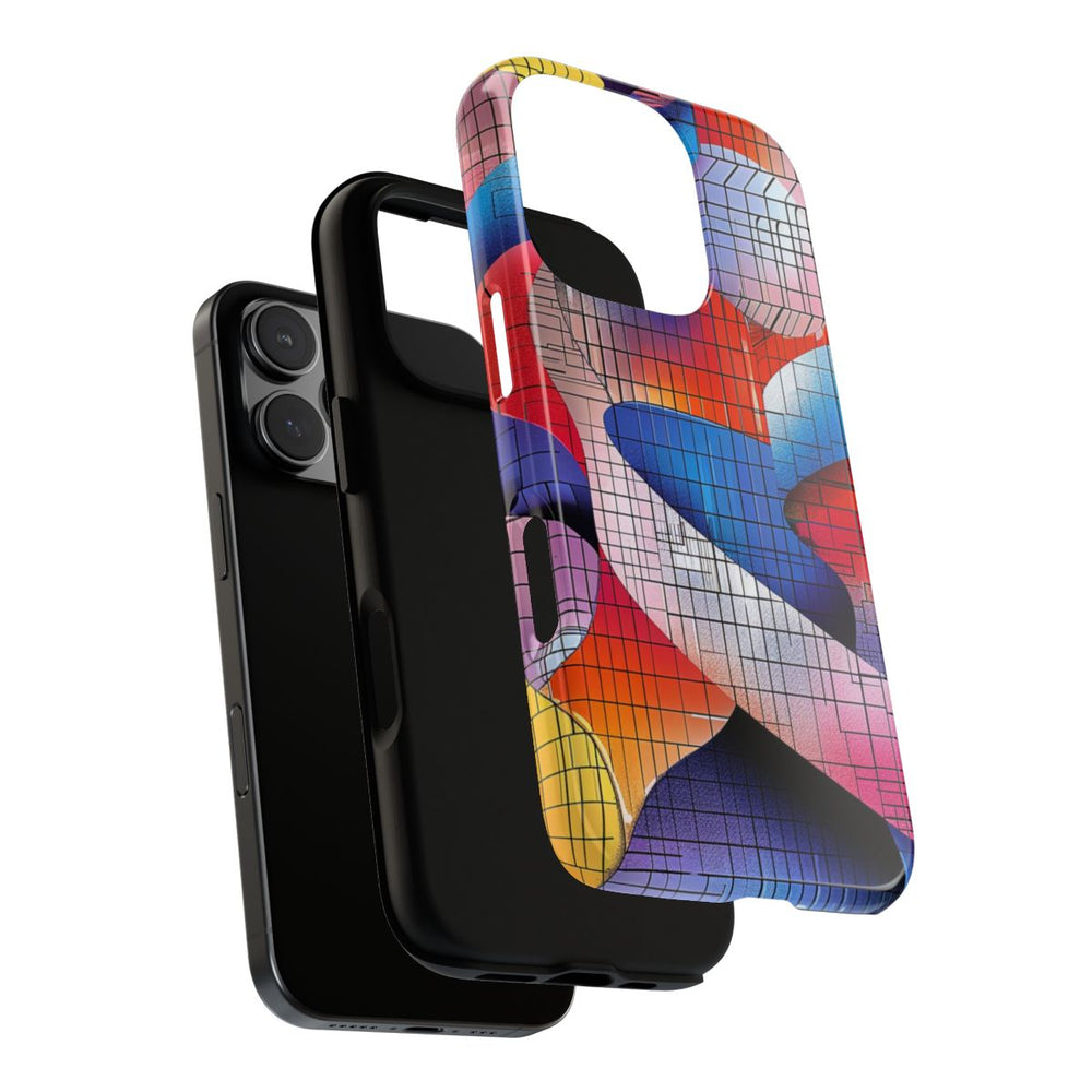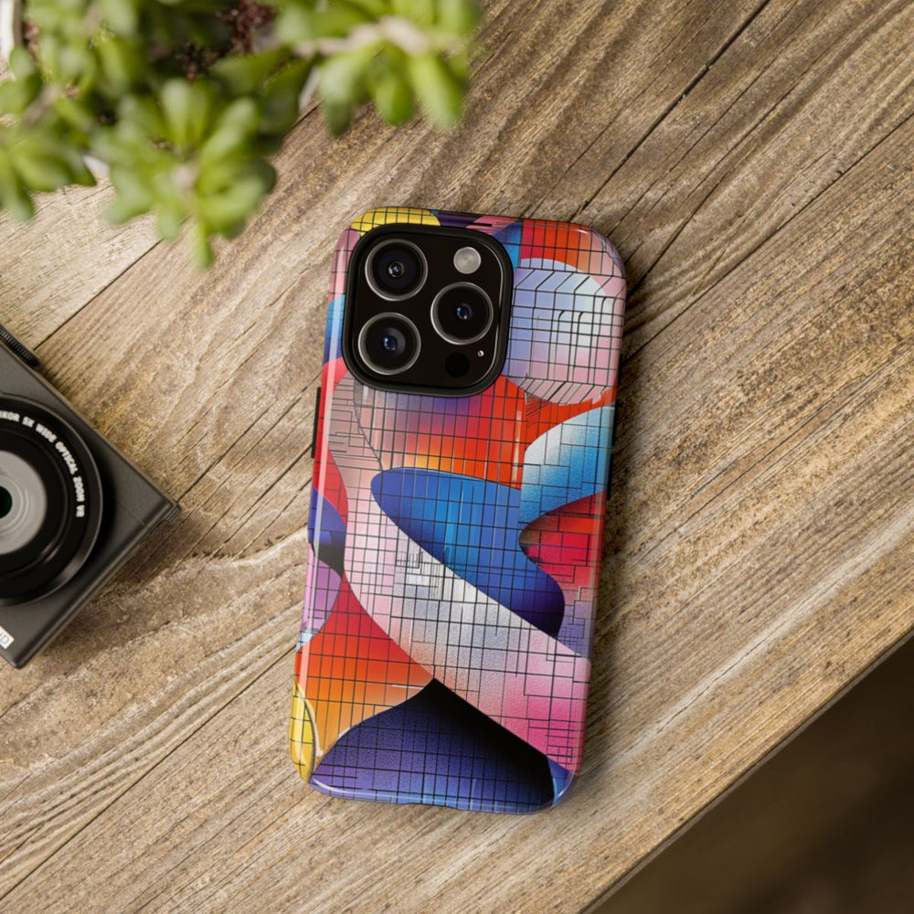 Dit hoesje heeft een abstract ontwerp met in elkaar verweven dubbele helixvormen in levendige kleuren zoals blauw, rood, roze, oranje, geel en paars. Over het ontwerp ligt een rasterpatroon van zwarte lijnen, wat zorgt voor een geometrische en moderne uitstraling. Het hoesje is glanzend afgewerkt en bestaat uit een stevige dubbele laag met een polycarbonaat buitenkant en een TPU-binnenzijde, wat zorgt voor duurzaamheid en optimale bescherming. Geschikt voor draadloos opladen en uitstekend bestand tegen verschillende weersomstandigheden.