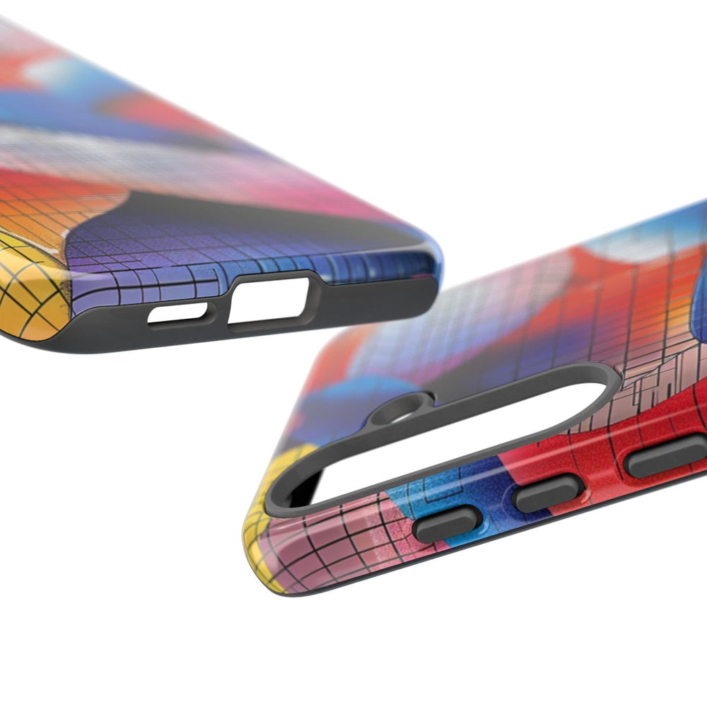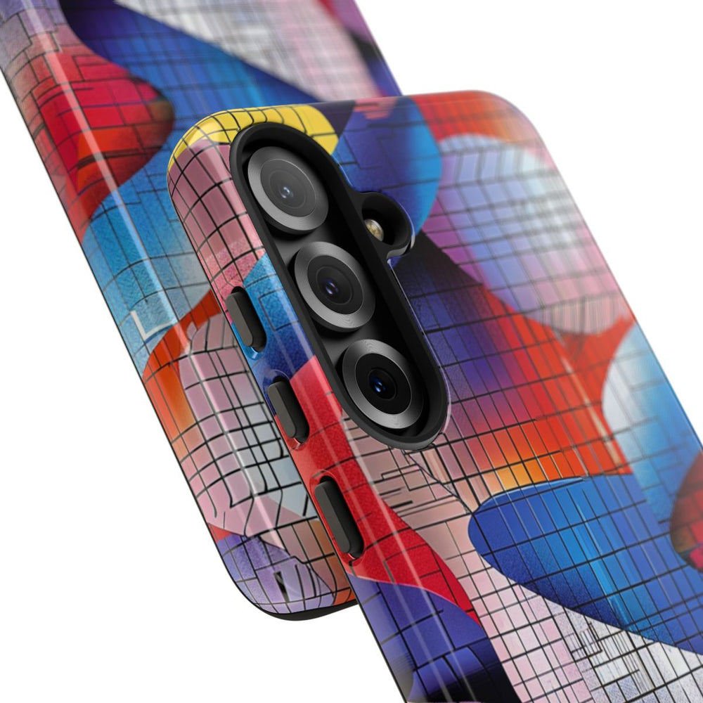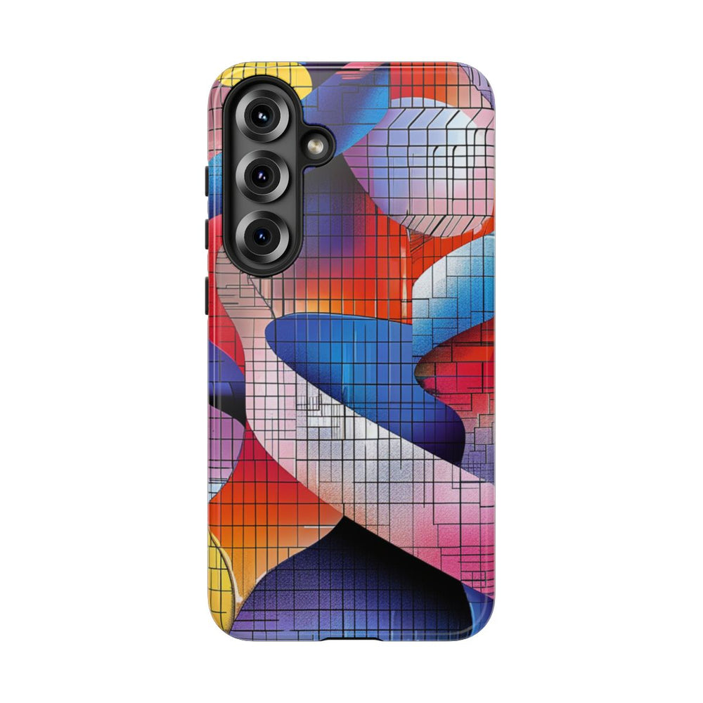 Dit hoesje heeft een abstract ontwerp met in elkaar verweven dubbele helixvormen in levendige kleuren zoals blauw, rood, roze, oranje, geel en paars. Over het ontwerp ligt een rasterpatroon van zwarte lijnen, wat zorgt voor een geometrische en moderne uitstraling. Het hoesje is glanzend afgewerkt en bestaat uit een stevige dubbele laag met een polycarbonaat buitenkant en een TPU-binnenzijde, wat zorgt voor duurzaamheid en optimale bescherming. Geschikt voor draadloos opladen en uitstekend bestand tegen verschillende weersomstandigheden.