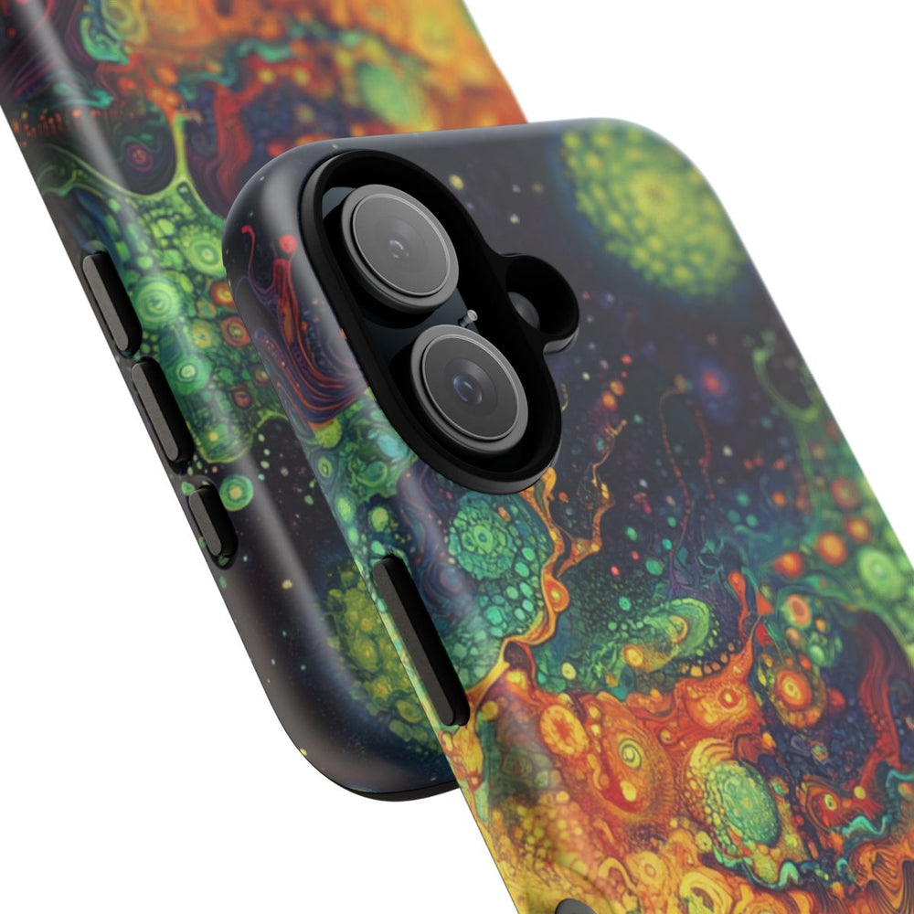Dit hoesje heeft een opvallend abstract fractaalpatroon met draaiende vormen en verfijnde details. Het ontwerp bestaat uit heldere kleuren zoals geel, oranje, groen en blauw, wat zorgt voor een dynamisch en energiek effect. De donkere achtergrond laat de kleuren extra goed uitkomen. Het hoesje bestaat uit twee lagen van polycarbonaat en TPU voor optimale bescherming en ondersteunt draadloos opladen.