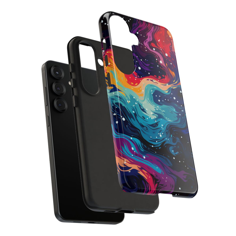 Dit telefoonhoesje heeft een opvallend abstract galaxy patroon met wervelende kleuren zoals blauw, paars, rood, oranje en teal. Heldere witte stippen en bollen verspreid over het ontwerp doen denken aan sterren en hemellichamen tegen een donkere achtergrond. Het geheel zorgt voor een dynamische en energieke kosmische uitstraling. Het hoesje heeft een glanzende afwerking en is stevig dankzij een polycarbonaat buitenkant en een TPU binnenzijde. Deze dubbele laag biedt extra bescherming en ondersteunt draadloos opladen. Het hoesje is bestand tegen invloeden van buitenaf en behoudt langdurig zijn heldere uitstraling.