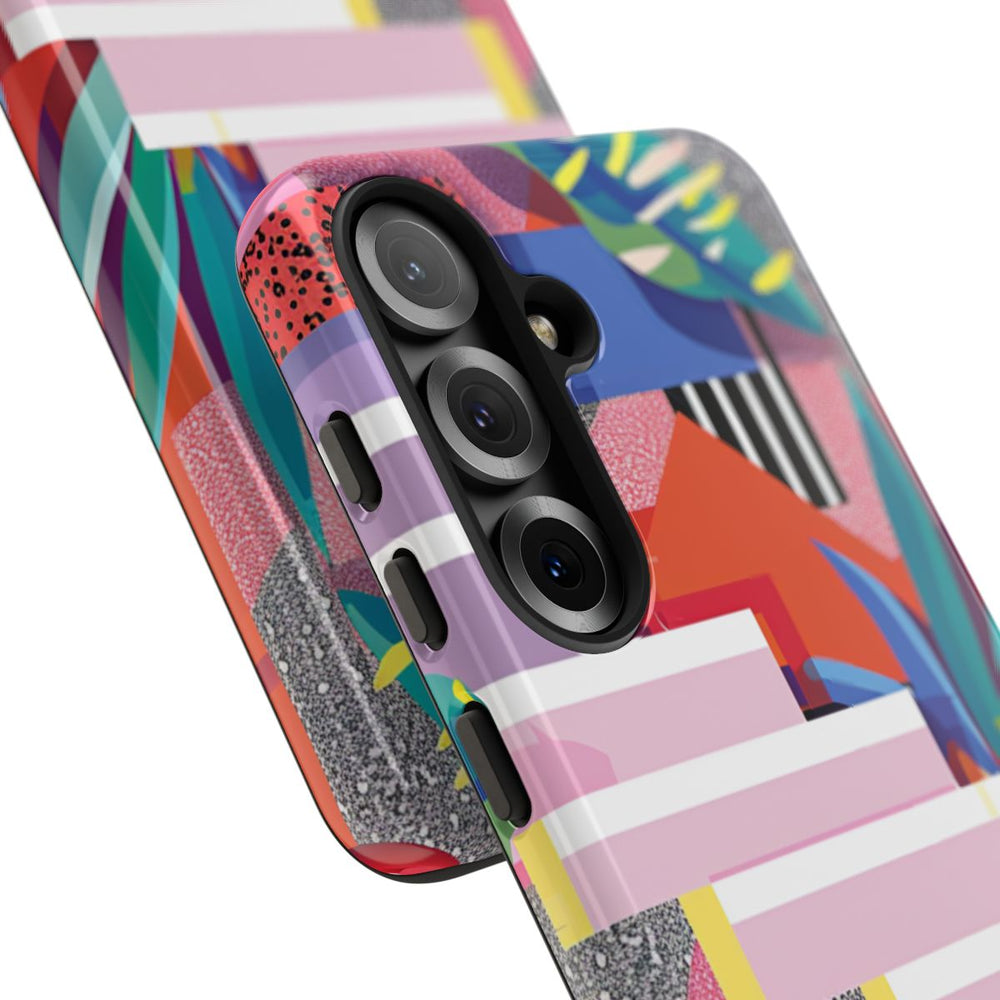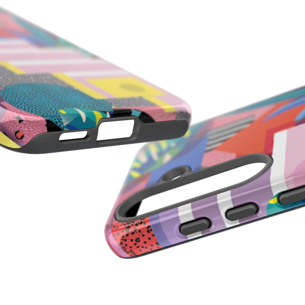 Dit telefoonhoesje heeft een levendig abstract ontwerp met geometrische vormen en botanische elementen. Het patroon bestaat uit gelaagde rechthoeken, cirkels en verschillende texturen in kleuren zoals roze, rood, geel, blauw en zwart. Tussen het ontwerp zijn gestileerde bladeren in tinten groen en blauw verwerkt. Het geheel oogt gedurfd en dynamisch door de combinatie van effen kleuren met gespikkelde en gestreepte patronen. Het hoesje is glanzend, stevig en gemaakt van polycarbonaat en TPU voor optimale bescherming en duurzaamheid. Ondersteunt draadloos opladen.