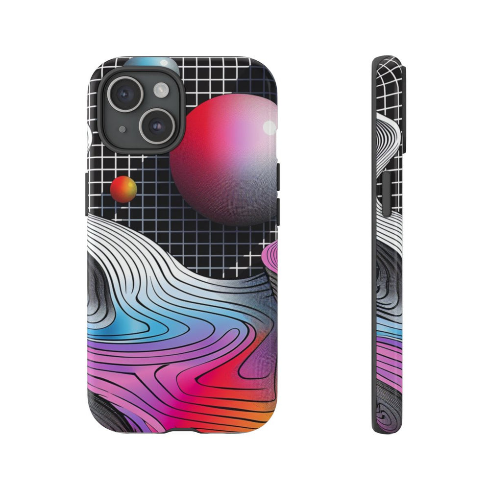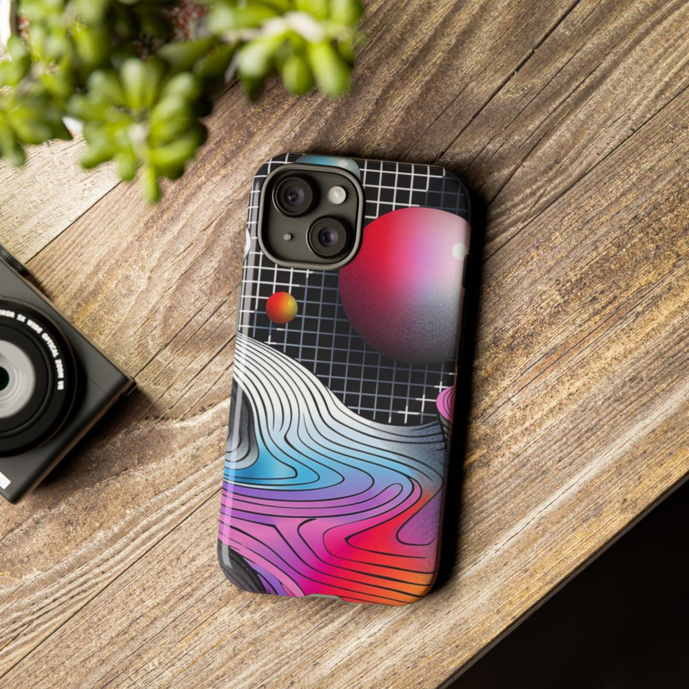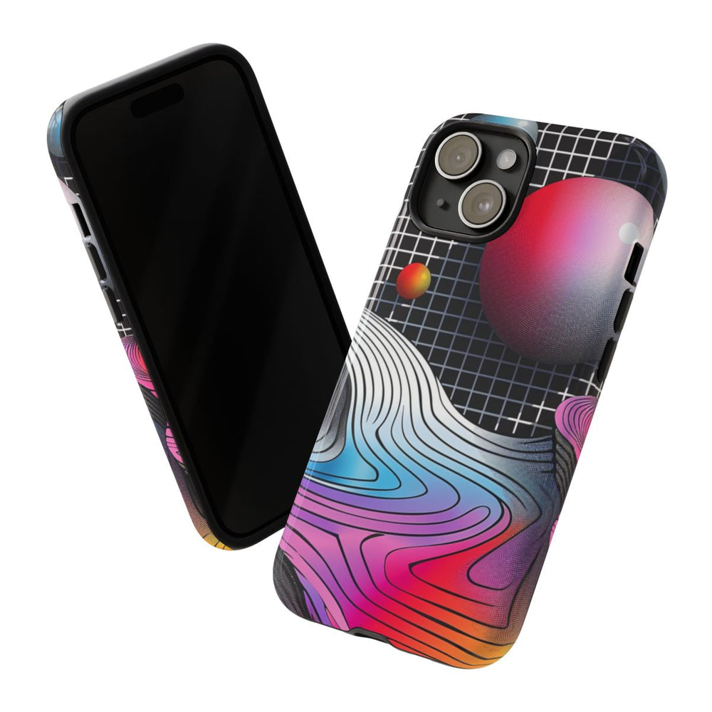 Dit hoesje heeft een opvallend abstract landschap met vloeiende, gelaagde vormen in heldere kleuren zoals blauw, roze, rood, geel en oranje. De achtergrond bestaat uit een zwart rasterpatroon, wat zorgt voor diepte en structuur. Zwevende bollen in tinten blauw, rood en geel geven een dynamisch, driedimensionaal effect. De afbeelding combineert vloeiende kleurverlopen met fijne lijndetails, waardoor een moderne en visueel aantrekkelijke geometrische compositie ontstaat. Het hoesje is gemaakt van stevige materialen en ondersteunt draadloos opladen.