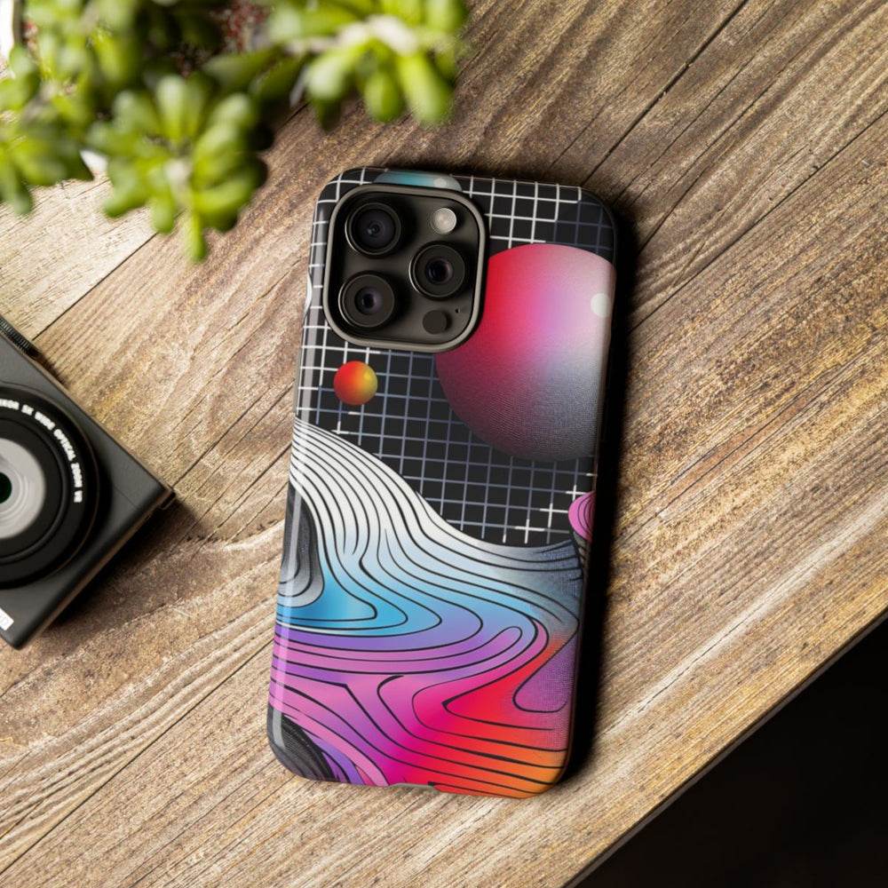 Dit hoesje heeft een opvallend abstract landschap met vloeiende, gelaagde vormen in heldere kleuren zoals blauw, roze, rood, geel en oranje. De achtergrond bestaat uit een zwart rasterpatroon, wat zorgt voor diepte en structuur. Zwevende bollen in tinten blauw, rood en geel geven een dynamisch, driedimensionaal effect. De afbeelding combineert vloeiende kleurverlopen met fijne lijndetails, waardoor een moderne en visueel aantrekkelijke geometrische compositie ontstaat. Het hoesje is gemaakt van stevige materialen en ondersteunt draadloos opladen.