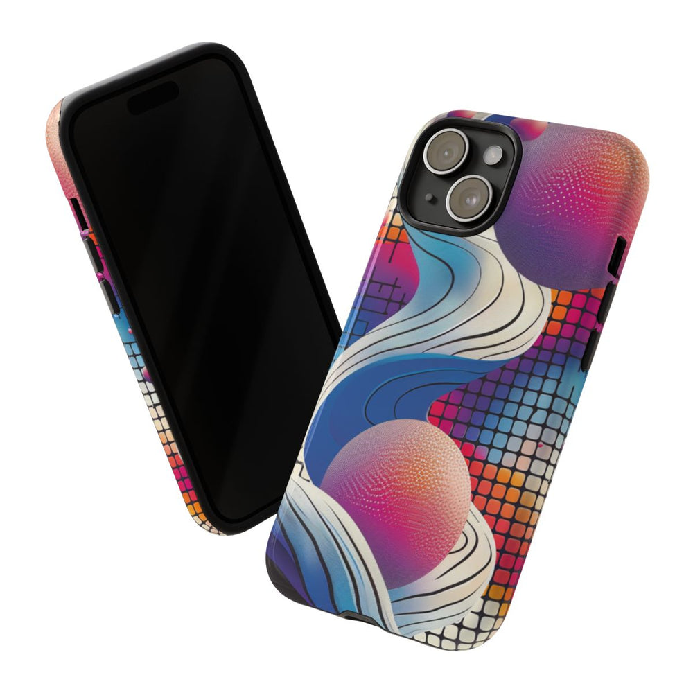 Dit hoesje heeft een levendig abstract ontwerp met vloeiende, lintachtige vormen in tinten blauw, wit en zwart. Verspreid over het ontwerp zweven roze en oranje bollen met een opvallende structuur, wat zorgt voor diepte en een speelse uitstraling. De achtergrond bestaat uit een rasterpatroon met vierkanten in kleurverlopen van oranje, roze, paars en blauw, wat een dynamisch en kleurrijk geheel oplevert. De afbeelding is gedrukt op een glanzend, stevig hoesje van duurzaam polycarbonaat met een TPU-binnenkant. Dit hoesje biedt uitstekende bescherming en ondersteunt draadloos opladen.