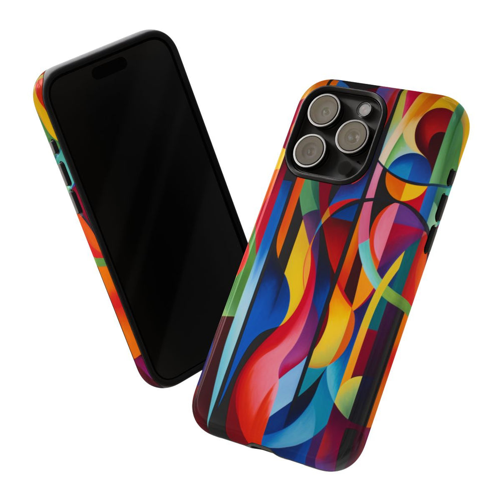 Dit hoesje heeft een opvallend abstract ontwerp met overlappende geometrische vormen en vloeiende lijnen. De afbeelding bestaat uit diepe tinten rood, blauw, geel, groen en oranje, wat zorgt voor een dynamisch en energiek geheel. De vormen zijn gelaagd aangebracht met scherpe randen en soepele kleurverlopen, waardoor diepte en beweging ontstaan. De print komt tot zijn recht op een glanzend en stevig hoesje met een dubbele laag voor extra bescherming. Ondersteunt draadloos opladen.