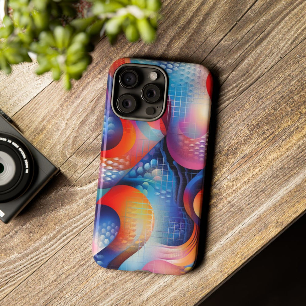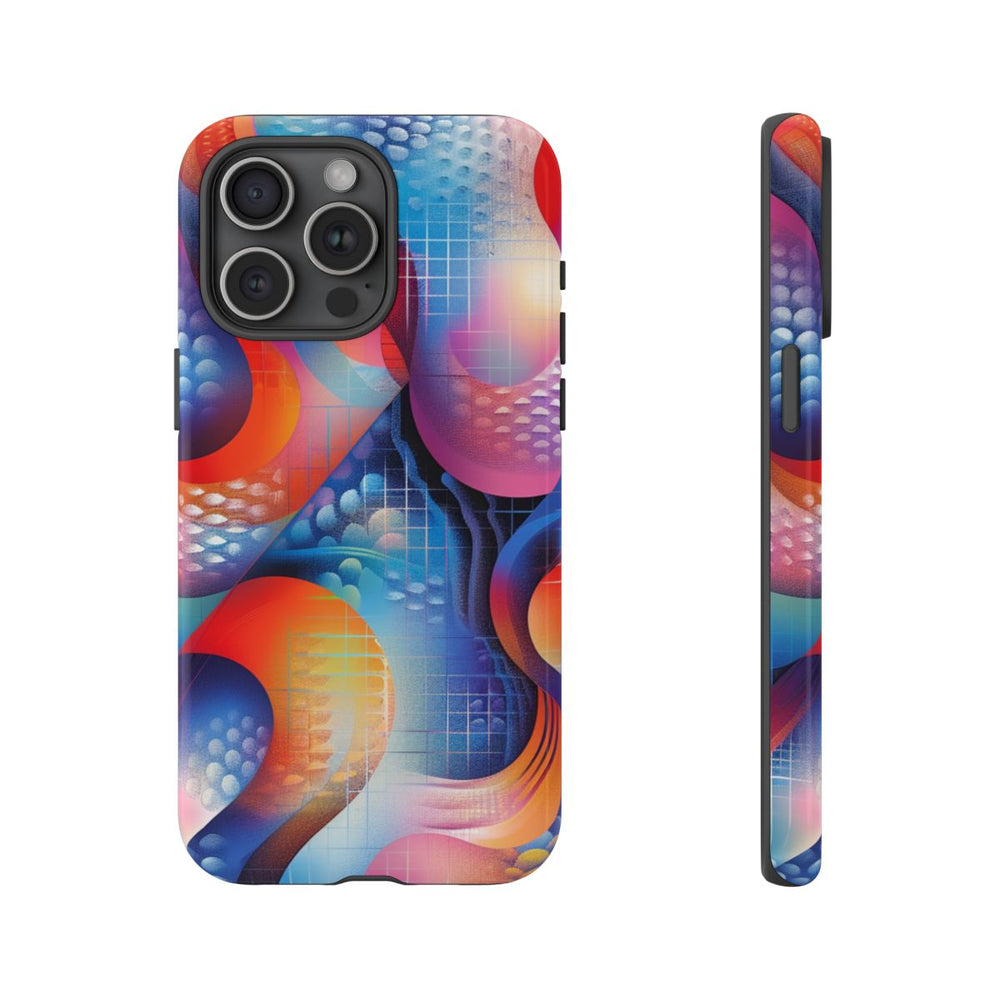 Dit telefoonhoesje heeft een opvallend abstract ontwerp met vloeiende organische vormen en verfijnde texturen. Het beeld bestaat uit een mix van heldere kleuren zoals rood, blauw, paars, oranje en roze, die in elkaar overlopen met kleurverloop en gestippelde patronen. Toegevoegde rasterlijnen zorgen voor een gestructureerd accent binnen de dynamische vormen, wat een levendig geheel oplevert. Het hoesje heeft een glanzende afwerking en bestaat uit twee lagen van polycarbonaat en TPU, waardoor het stevig is en geschikt voor draadloos opladen.