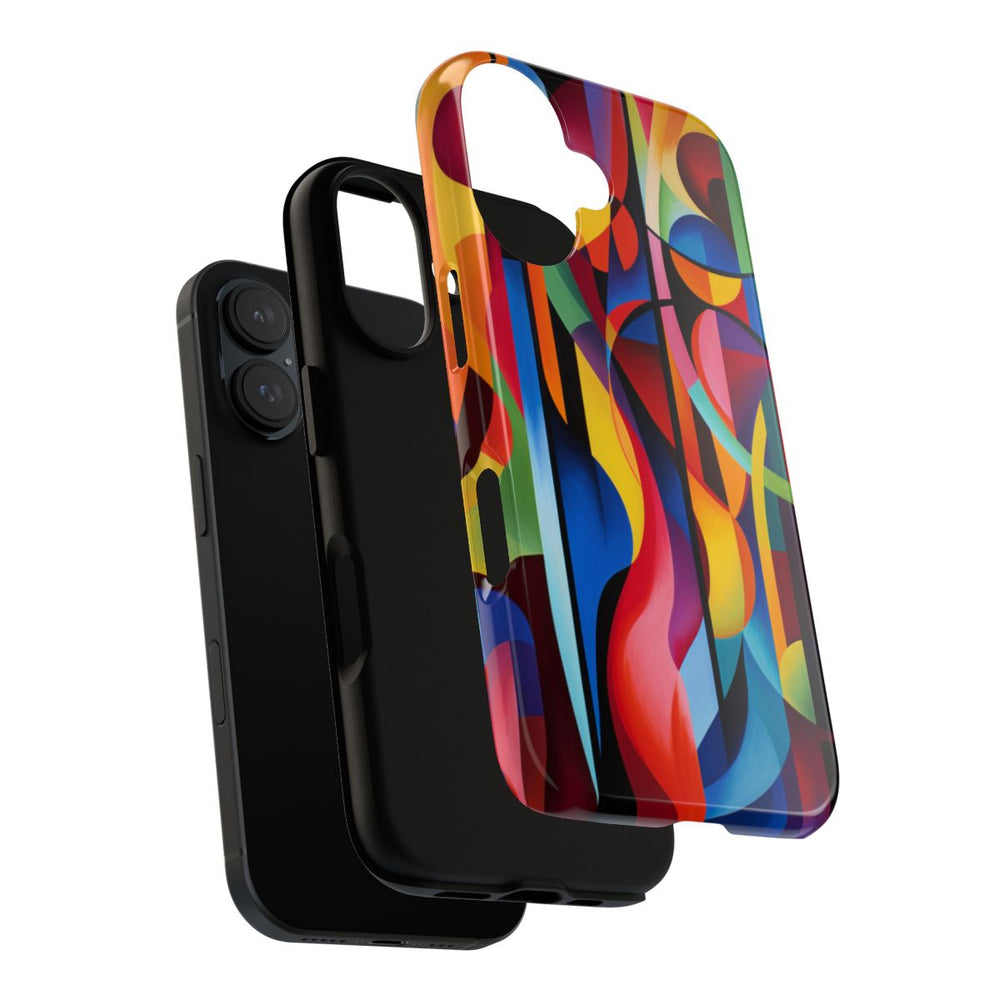 Dit hoesje heeft een opvallend abstract ontwerp met overlappende geometrische vormen en vloeiende lijnen. De afbeelding bestaat uit diepe tinten rood, blauw, geel, groen en oranje, wat zorgt voor een dynamisch en energiek geheel. De vormen zijn gelaagd aangebracht met scherpe randen en soepele kleurverlopen, waardoor diepte en beweging ontstaan. De print komt tot zijn recht op een glanzend en stevig hoesje met een dubbele laag voor extra bescherming. Ondersteunt draadloos opladen.
