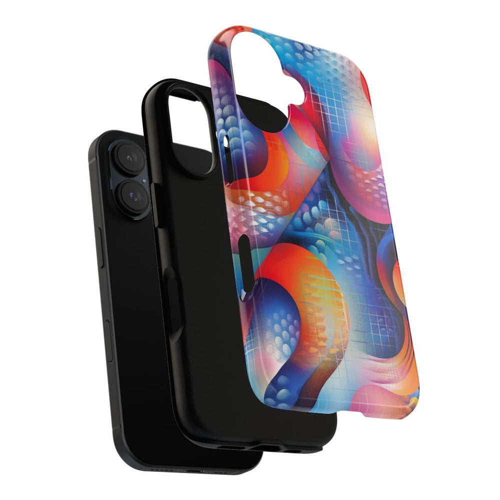 Dit telefoonhoesje heeft een opvallend abstract ontwerp met vloeiende organische vormen en verfijnde texturen. Het beeld bestaat uit een mix van heldere kleuren zoals rood, blauw, paars, oranje en roze, die in elkaar overlopen met kleurverloop en gestippelde patronen. Toegevoegde rasterlijnen zorgen voor een gestructureerd accent binnen de dynamische vormen, wat een levendig geheel oplevert. Het hoesje heeft een glanzende afwerking en bestaat uit twee lagen van polycarbonaat en TPU, waardoor het stevig is en geschikt voor draadloos opladen.