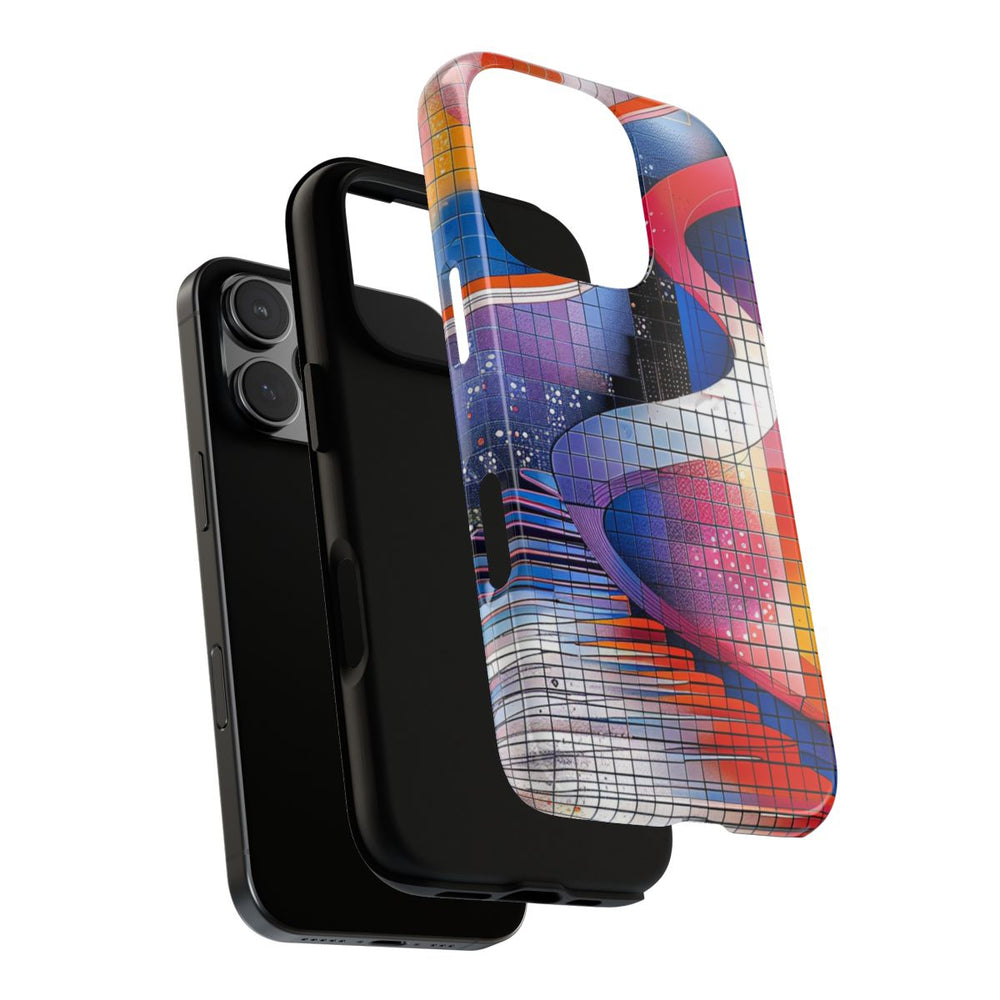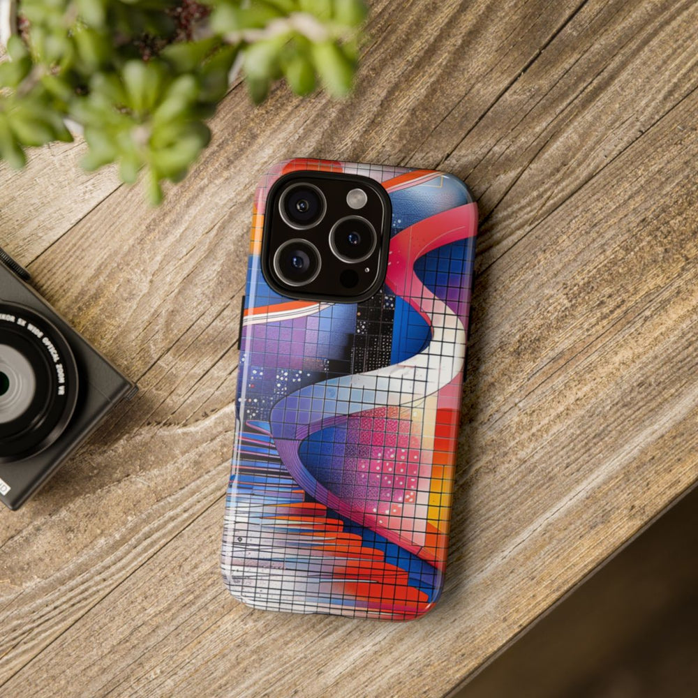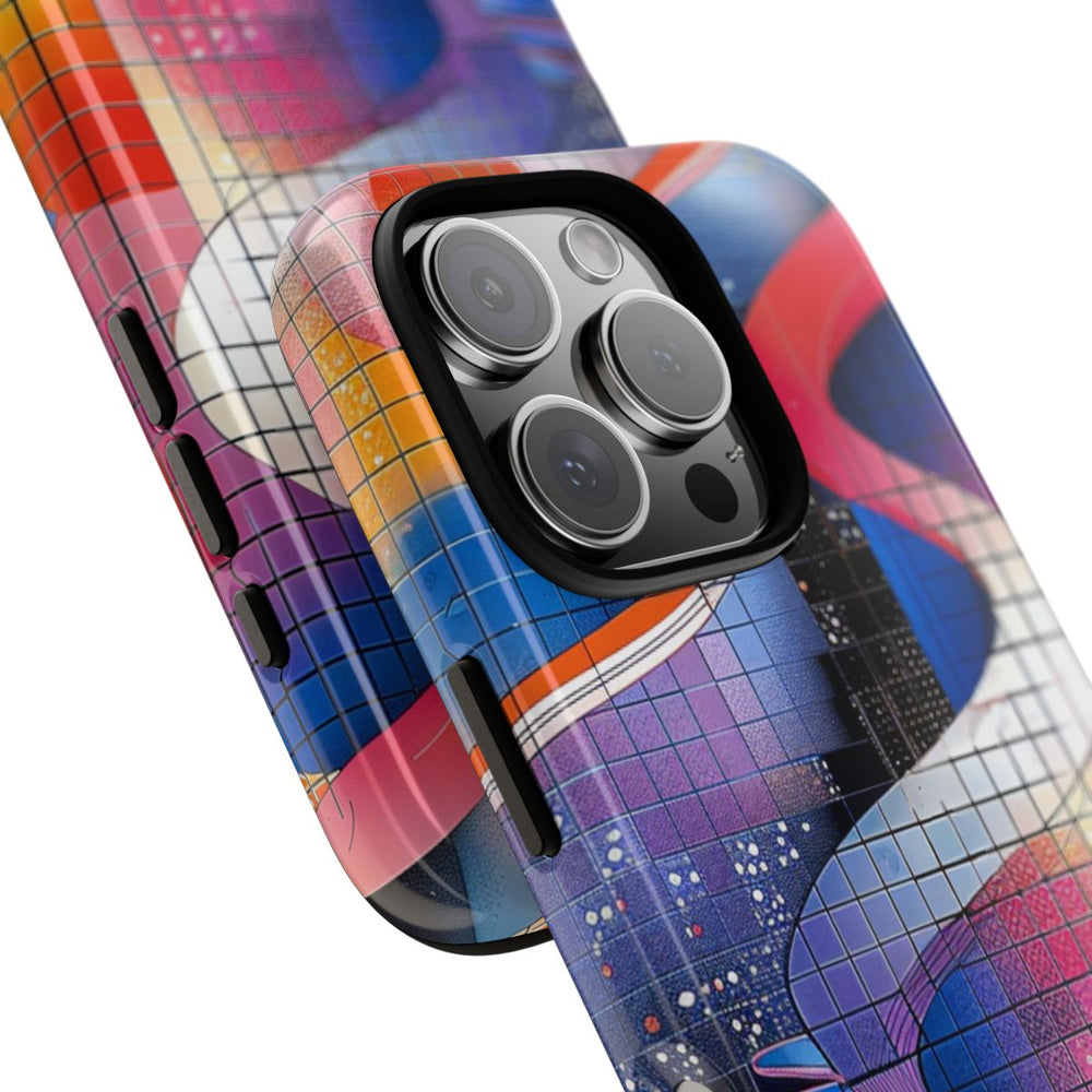 Dit hoesje is voorzien van een abstract geometrisch patroon met een levendige mix van kleuren zoals oranje, blauw, roze, paars en wit. Het ontwerp bestaat uit een raster met verschillende vormen, waaronder cirkels, gebogen lijnen en gelaagde accenten, wat zorgt voor een dynamisch en opvallend geheel. De combinatie van vloeiende kleurverlopen en subtiele texturen geeft het hoesje een moderne, artistieke uitstraling. Het glanzende, stevige hoesje heeft een dubbele laag voor extra duurzaamheid en bescherming, en ondersteunt draadloos opladen.