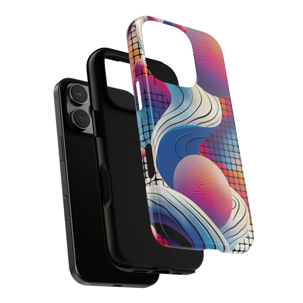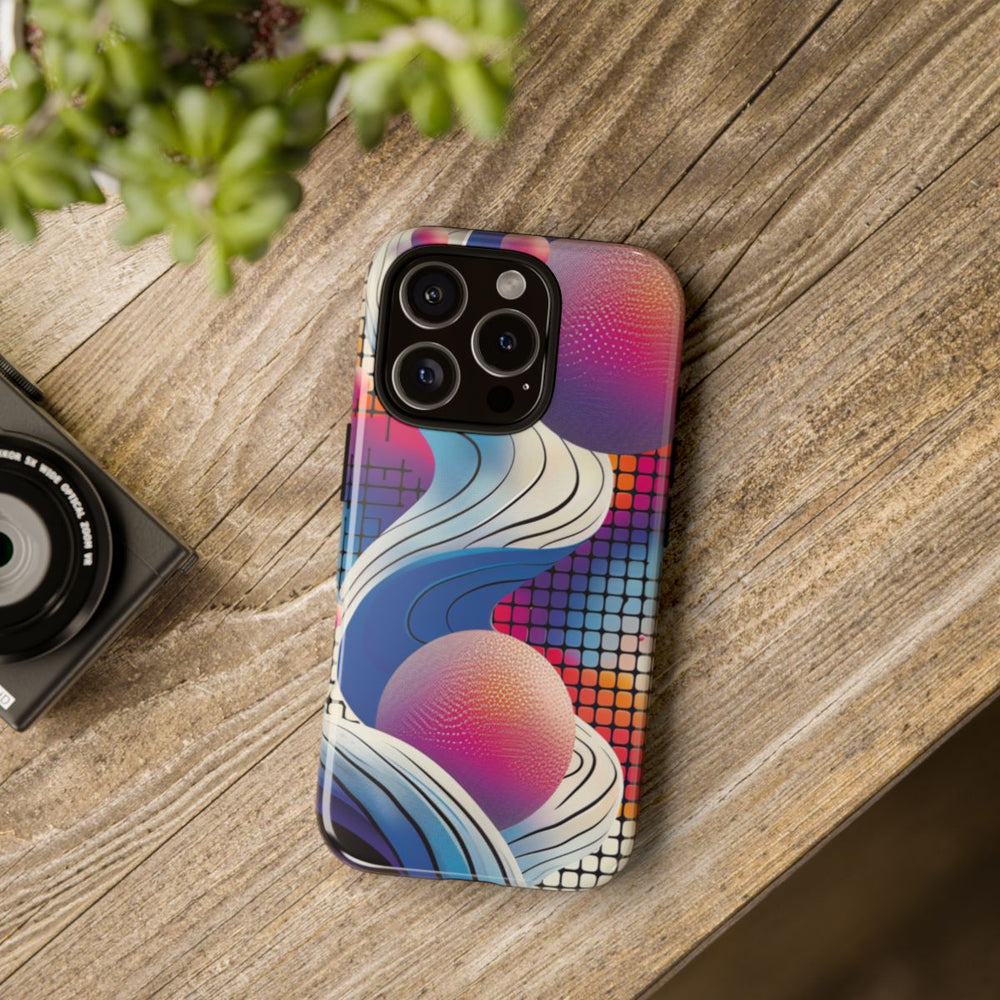 Dit hoesje heeft een levendig abstract ontwerp met vloeiende, lintachtige vormen in tinten blauw, wit en zwart. Verspreid over het ontwerp zweven roze en oranje bollen met een opvallende structuur, wat zorgt voor diepte en een speelse uitstraling. De achtergrond bestaat uit een rasterpatroon met vierkanten in kleurverlopen van oranje, roze, paars en blauw, wat een dynamisch en kleurrijk geheel oplevert. De afbeelding is gedrukt op een glanzend, stevig hoesje van duurzaam polycarbonaat met een TPU-binnenkant. Dit hoesje biedt uitstekende bescherming en ondersteunt draadloos opladen.