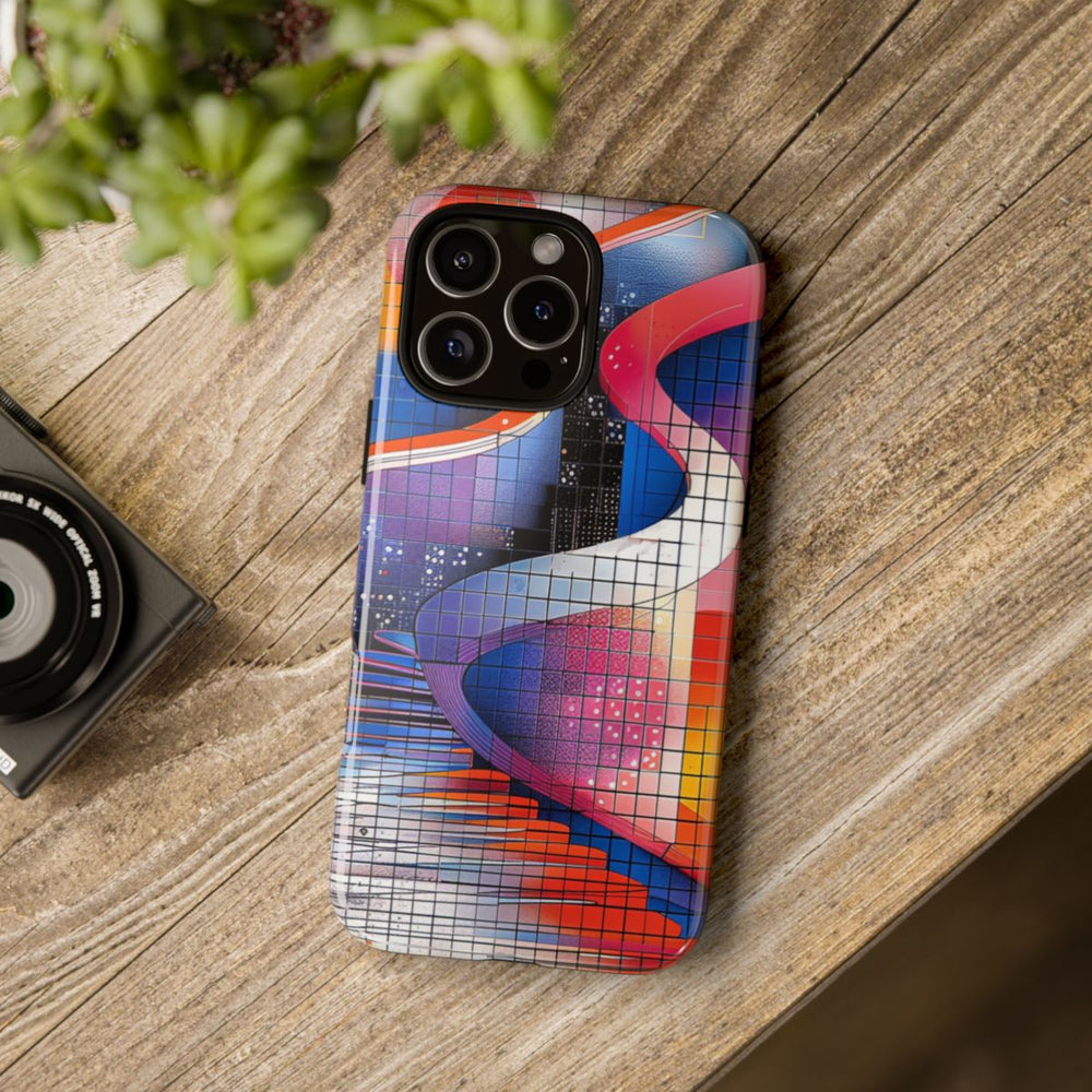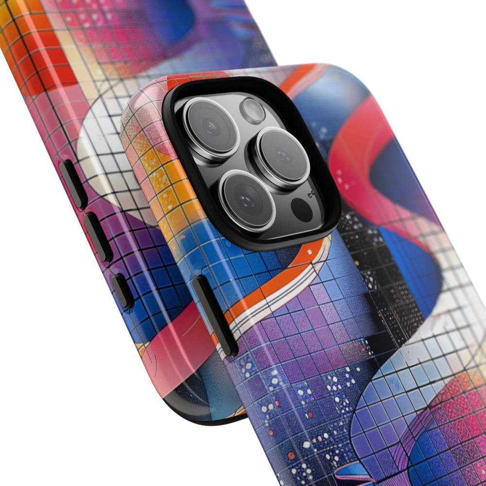 Dit hoesje is voorzien van een abstract geometrisch patroon met een levendige mix van kleuren zoals oranje, blauw, roze, paars en wit. Het ontwerp bestaat uit een raster met verschillende vormen, waaronder cirkels, gebogen lijnen en gelaagde accenten, wat zorgt voor een dynamisch en opvallend geheel. De combinatie van vloeiende kleurverlopen en subtiele texturen geeft het hoesje een moderne, artistieke uitstraling. Het glanzende, stevige hoesje heeft een dubbele laag voor extra duurzaamheid en bescherming, en ondersteunt draadloos opladen.