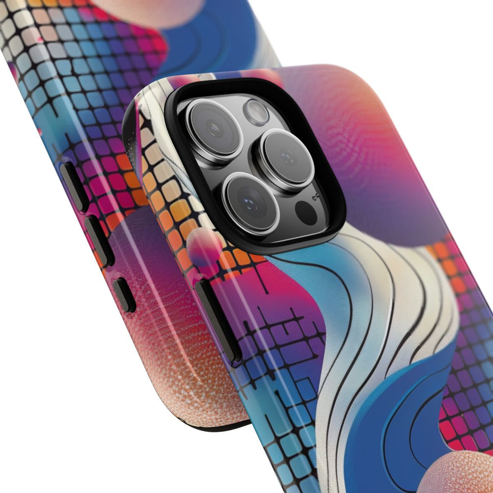 Dit hoesje heeft een levendig abstract ontwerp met vloeiende, lintachtige vormen in tinten blauw, wit en zwart. Verspreid over het ontwerp zweven roze en oranje bollen met een opvallende structuur, wat zorgt voor diepte en een speelse uitstraling. De achtergrond bestaat uit een rasterpatroon met vierkanten in kleurverlopen van oranje, roze, paars en blauw, wat een dynamisch en kleurrijk geheel oplevert. De afbeelding is gedrukt op een glanzend, stevig hoesje van duurzaam polycarbonaat met een TPU-binnenkant. Dit hoesje biedt uitstekende bescherming en ondersteunt draadloos opladen.