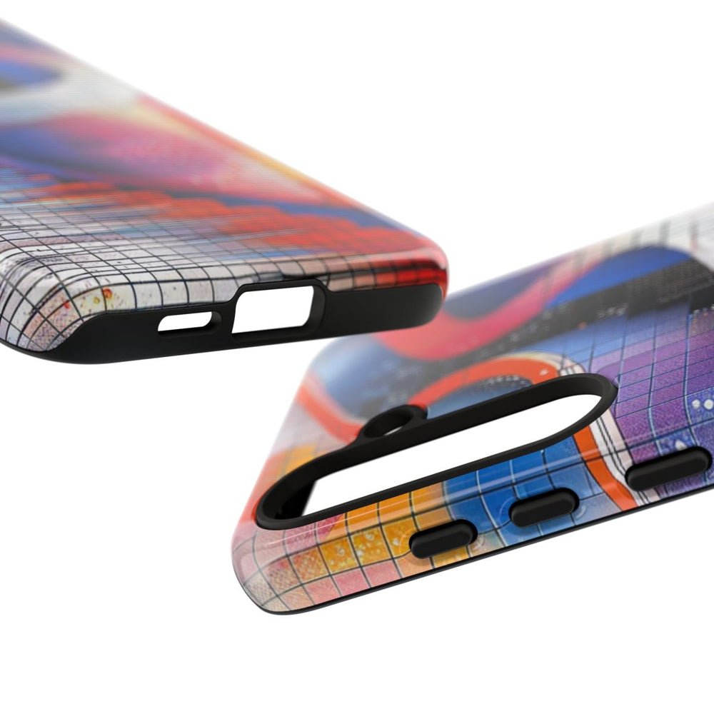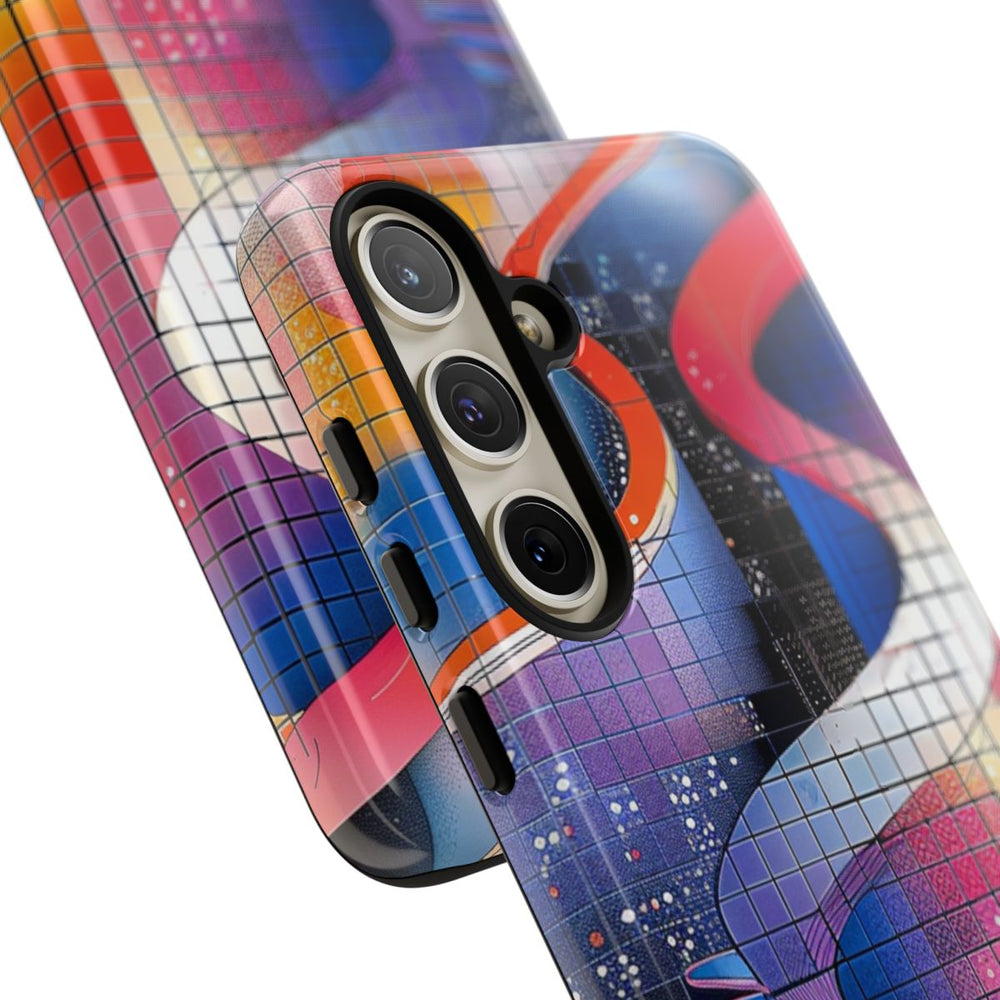 Dit hoesje is voorzien van een abstract geometrisch patroon met een levendige mix van kleuren zoals oranje, blauw, roze, paars en wit. Het ontwerp bestaat uit een raster met verschillende vormen, waaronder cirkels, gebogen lijnen en gelaagde accenten, wat zorgt voor een dynamisch en opvallend geheel. De combinatie van vloeiende kleurverlopen en subtiele texturen geeft het hoesje een moderne, artistieke uitstraling. Het glanzende, stevige hoesje heeft een dubbele laag voor extra duurzaamheid en bescherming, en ondersteunt draadloos opladen.