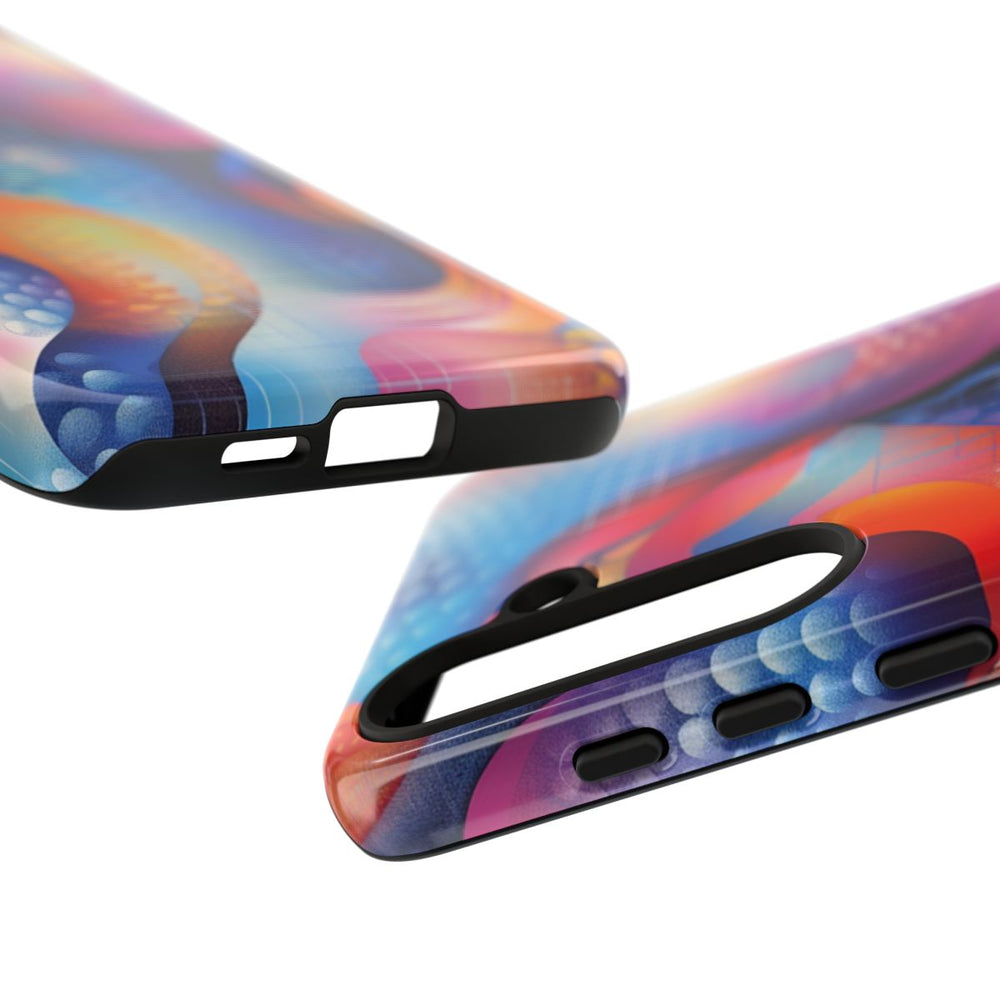 Dit telefoonhoesje heeft een opvallend abstract ontwerp met vloeiende organische vormen en verfijnde texturen. Het beeld bestaat uit een mix van heldere kleuren zoals rood, blauw, paars, oranje en roze, die in elkaar overlopen met kleurverloop en gestippelde patronen. Toegevoegde rasterlijnen zorgen voor een gestructureerd accent binnen de dynamische vormen, wat een levendig geheel oplevert. Het hoesje heeft een glanzende afwerking en bestaat uit twee lagen van polycarbonaat en TPU, waardoor het stevig is en geschikt voor draadloos opladen.
