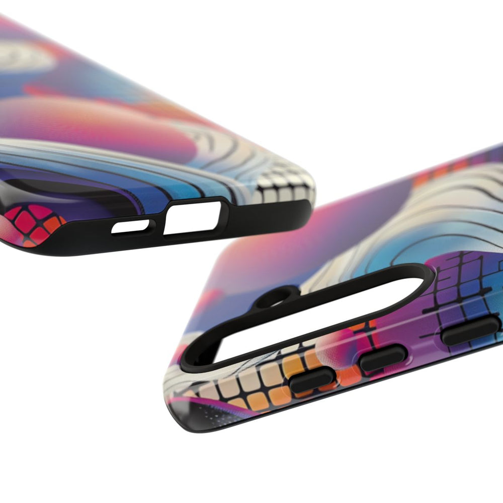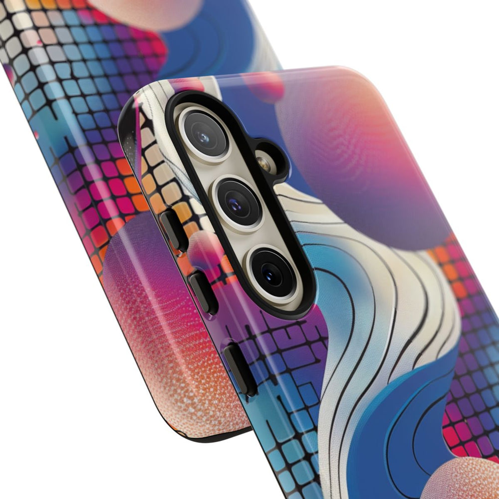 Dit hoesje heeft een levendig abstract ontwerp met vloeiende, lintachtige vormen in tinten blauw, wit en zwart. Verspreid over het ontwerp zweven roze en oranje bollen met een opvallende structuur, wat zorgt voor diepte en een speelse uitstraling. De achtergrond bestaat uit een rasterpatroon met vierkanten in kleurverlopen van oranje, roze, paars en blauw, wat een dynamisch en kleurrijk geheel oplevert. De afbeelding is gedrukt op een glanzend, stevig hoesje van duurzaam polycarbonaat met een TPU-binnenkant. Dit hoesje biedt uitstekende bescherming en ondersteunt draadloos opladen.