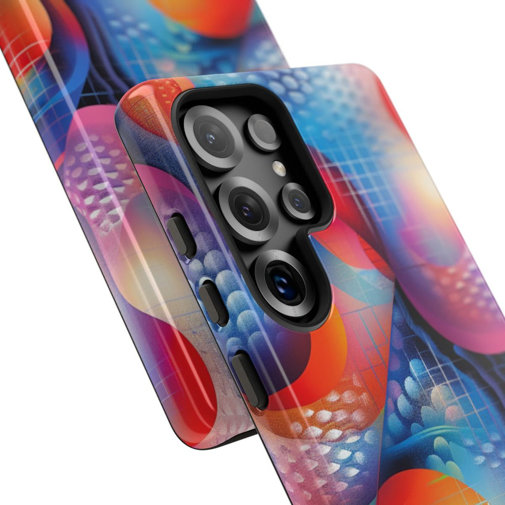 Dit telefoonhoesje heeft een opvallend abstract ontwerp met vloeiende organische vormen en verfijnde texturen. Het beeld bestaat uit een mix van heldere kleuren zoals rood, blauw, paars, oranje en roze, die in elkaar overlopen met kleurverloop en gestippelde patronen. Toegevoegde rasterlijnen zorgen voor een gestructureerd accent binnen de dynamische vormen, wat een levendig geheel oplevert. Het hoesje heeft een glanzende afwerking en bestaat uit twee lagen van polycarbonaat en TPU, waardoor het stevig is en geschikt voor draadloos opladen.