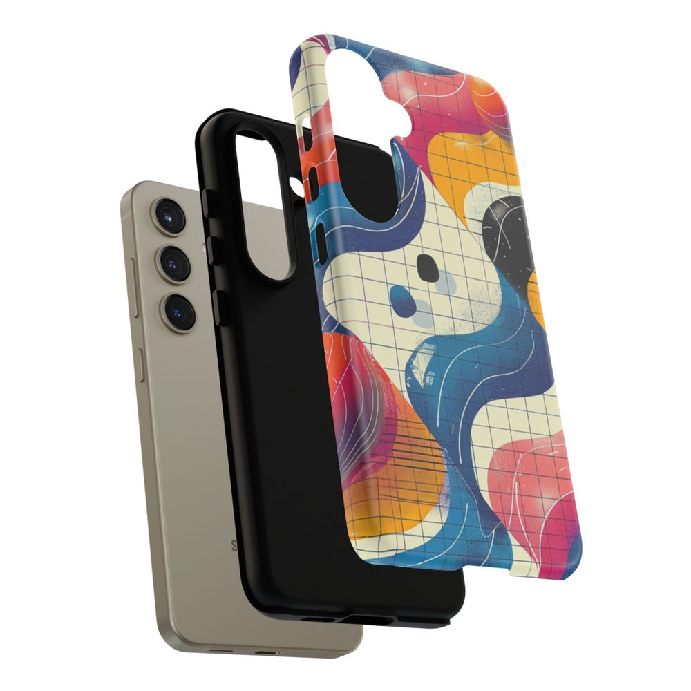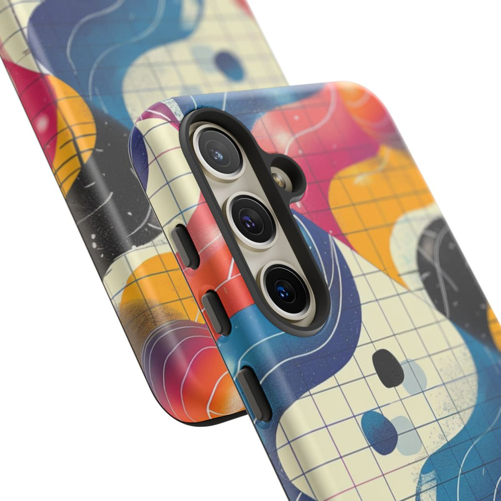 Dit hoesje heeft een abstract geometrisch patroon met golvende vormen in levendige kleuren zoals blauw, oranje, roze, geel, zwart en wit. De achtergrond bestaat uit een crèmekleurig raster dat een gestructureerd contrast vormt met de organische lijnen. Twee opvallende oranje bollen met witte contourlijnen zorgen voor diepte en dimensie. Het hoesje is voorzien van een dubbele laag van polycarbonaat en TPU voor extra stevigheid en bescherming, en ondersteunt draadloos opladen.