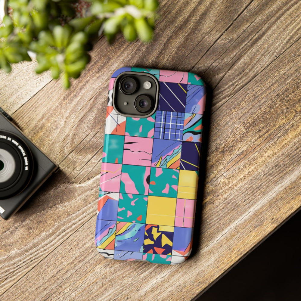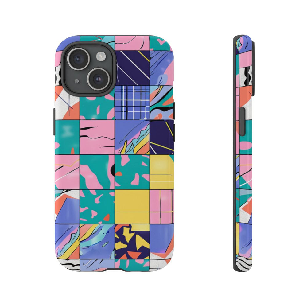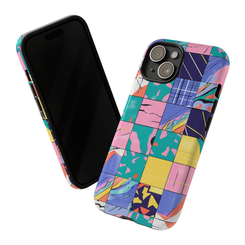 Dit telefoonhoesje heeft een levendig tegelpatroon met verschillende abstracte geometrische vormen en lijnen. Het ontwerp bestaat uit blokken roze, turquoise, geel, blauw en koraal, aangevuld met zwarte en witte accenten. De vormen variëren van golvende lijnen tot rasterstructuren en onregelmatige figuren, wat zorgt voor een dynamisch en modern effect. Het patroon is gedrukt op een glanzend, stevig hoesje van duurzaam polycarbonaat met een TPU-voering, dat optimale bescherming biedt en geschikt is voor draadloos opladen.