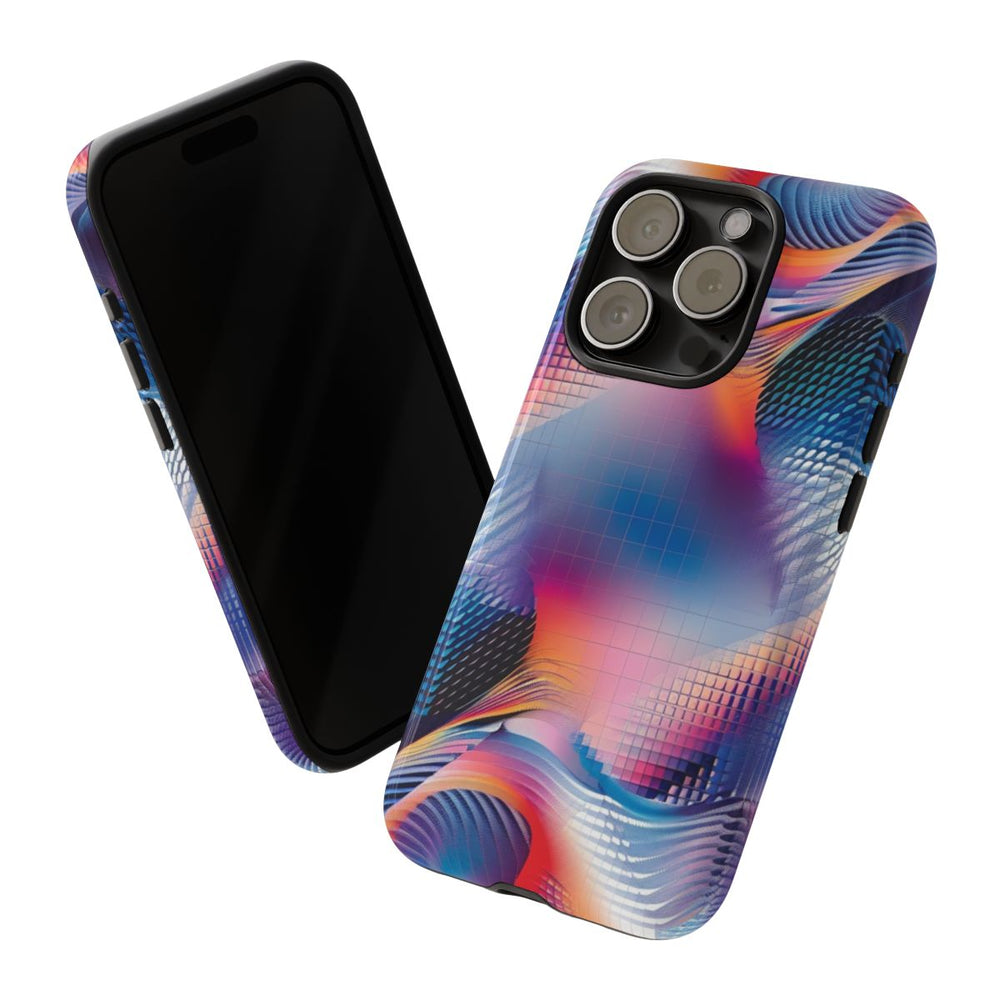 Dit hoesje heeft een verfijnd abstract geometrisch patroon met een levendige mix van kleuren zoals blauw, roze, rood, oranje en wit. Het ontwerp bevat rasterachtige structuren en vloeiende vormen die zorgen voor diepte en dynamiek. De afbeelding heeft een glanzende afwerking en het stevige hoesje is gemaakt van duurzaam polycarbonaat met een TPU-voering, wat optimale bescherming biedt en draadloos opladen ondersteunt. De heldere kleuren en complexe vormen geven het hoesje een moderne, artistieke uitstraling.