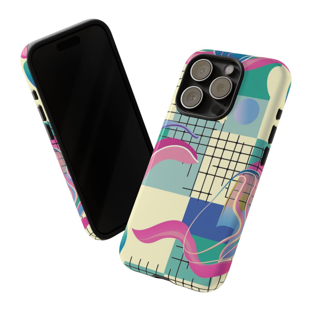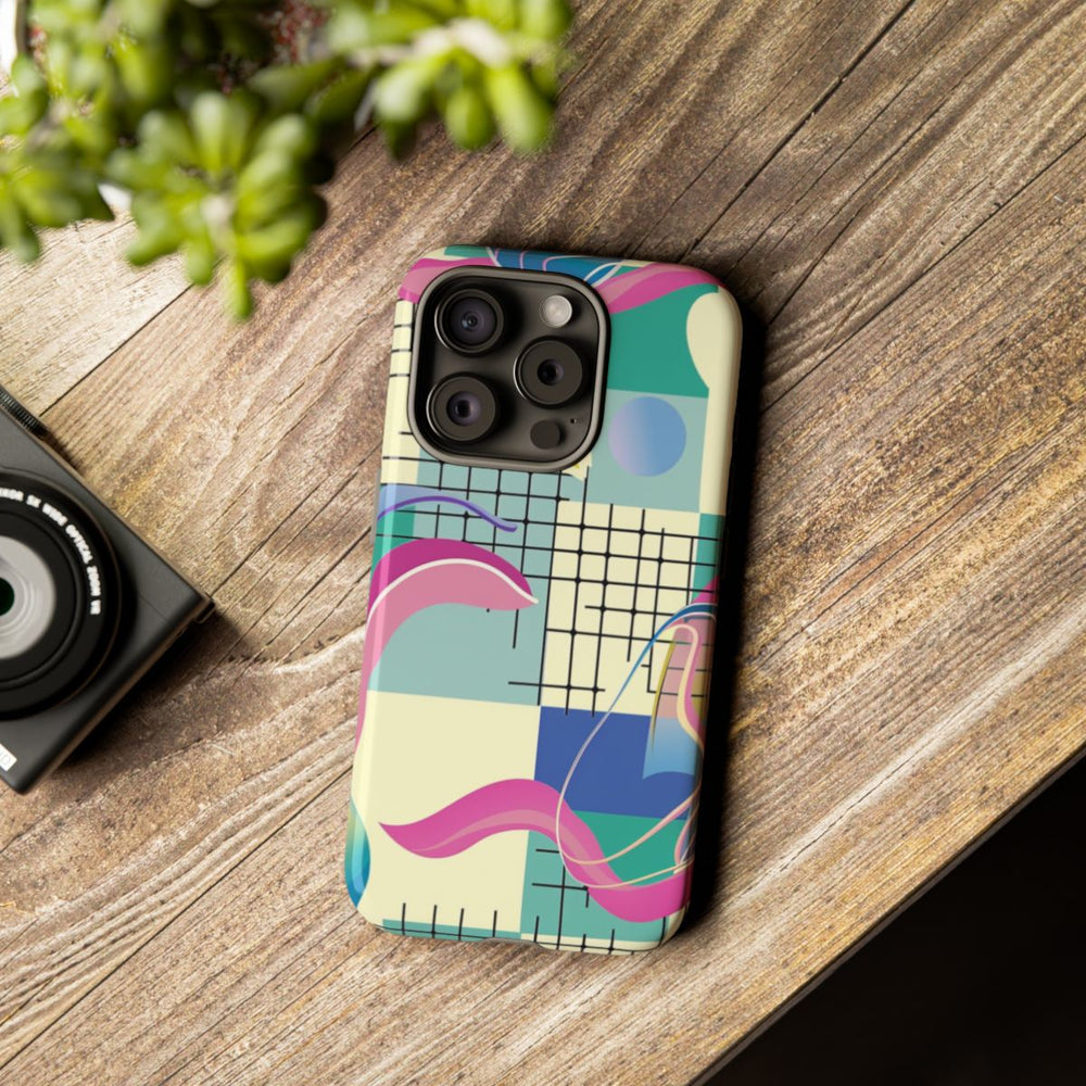 Dit telefoonhoesje heeft een opvallend abstract geometrisch ontwerp met een speelse mix van vormen en kleuren. Je ziet onder andere blauwe en gele bollen, roze en paarse linten en zwarte rasterlijnen op een achtergrond van crème, blauwgroene en blauwe vlakken. Het patroon is dynamisch en levendig, met een combinatie van vloeiende lijnen en strakke rasters. Het hoesje heeft een glanzende afwerking en bestaat uit een stevige dubbele laag van een polycarbonaat buitenkant en een TPU-binnenzijde. Dit zorgt voor extra stevigheid en bescherming, terwijl draadloos opladen gewoon mogelijk blijft.