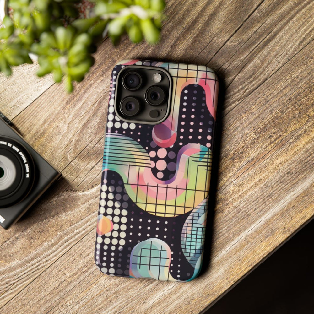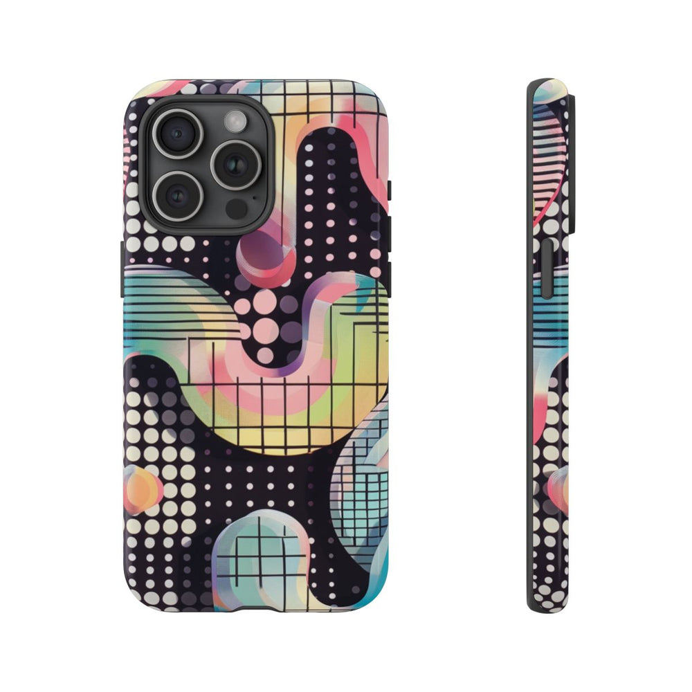 Dit telefoonhoesje heeft een levendig, abstract geometrisch patroon met vloeiende, golvende vormen in pastelkleuren zoals roze, blauw, geel en groen. De zwarte achtergrond is versierd met een raster van witte en lichtgekleurde stippen. Sommige vormen zijn voorzien van fijne zwarte rasterlijnen, wat extra diepte en detail geeft aan het ontwerp. Het hoesje is glanzend en stevig, gemaakt van polycarbonaat met een TPU-voering voor dubbele bescherming. Ondersteunt draadloos opladen.