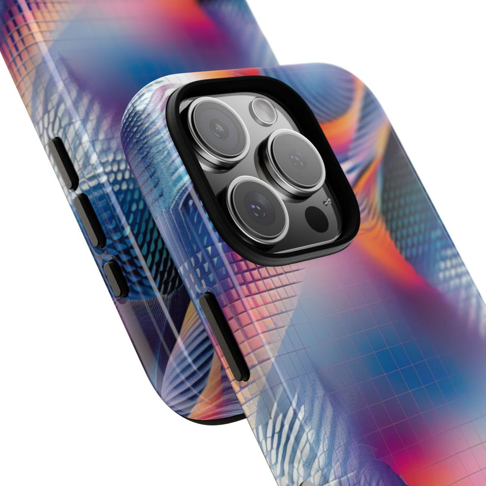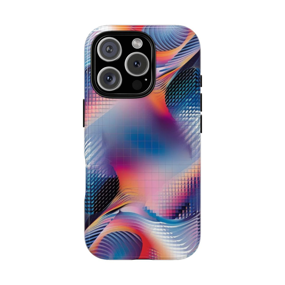 Dit hoesje heeft een verfijnd abstract geometrisch patroon met een levendige mix van kleuren zoals blauw, roze, rood, oranje en wit. Het ontwerp bevat rasterachtige structuren en vloeiende vormen die zorgen voor diepte en dynamiek. De afbeelding heeft een glanzende afwerking en het stevige hoesje is gemaakt van duurzaam polycarbonaat met een TPU-voering, wat optimale bescherming biedt en draadloos opladen ondersteunt. De heldere kleuren en complexe vormen geven het hoesje een moderne, artistieke uitstraling.