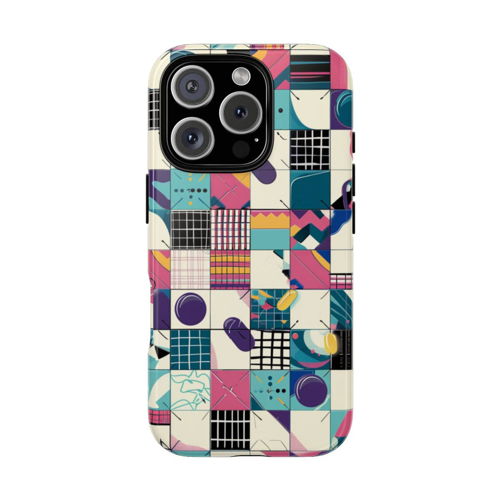 Dit hoesje heeft een opvallend abstract geometrisch patroon, opgebouwd uit kleine vierkante tegels die in een raster zijn gerangschikt. In het ontwerp komen diverse vormen voor, zoals cirkels, lijnen, rasters en golven, in een speelse mix van kleuren zoals teal, roze, paars, zwart, geel en crème. Het geheel straalt een moderne, artistieke sfeer uit door de combinatie van effen en getextureerde elementen. Het hoesje is glanzend afgewerkt en bestaat uit twee lagen voor extra stevigheid en bescherming. Geschikt voor draadloos opladen.