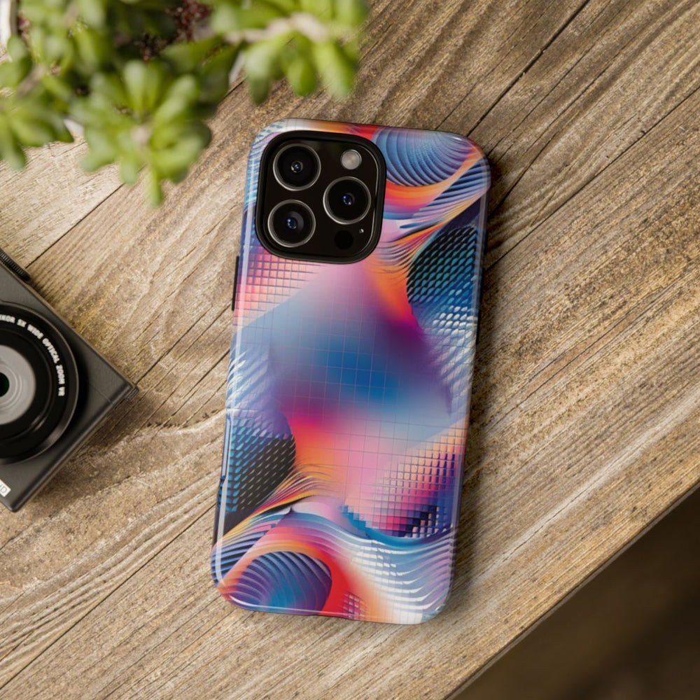 Dit hoesje heeft een verfijnd abstract geometrisch patroon met een levendige mix van kleuren zoals blauw, roze, rood, oranje en wit. Het ontwerp bevat rasterachtige structuren en vloeiende vormen die zorgen voor diepte en dynamiek. De afbeelding heeft een glanzende afwerking en het stevige hoesje is gemaakt van duurzaam polycarbonaat met een TPU-voering, wat optimale bescherming biedt en draadloos opladen ondersteunt. De heldere kleuren en complexe vormen geven het hoesje een moderne, artistieke uitstraling.