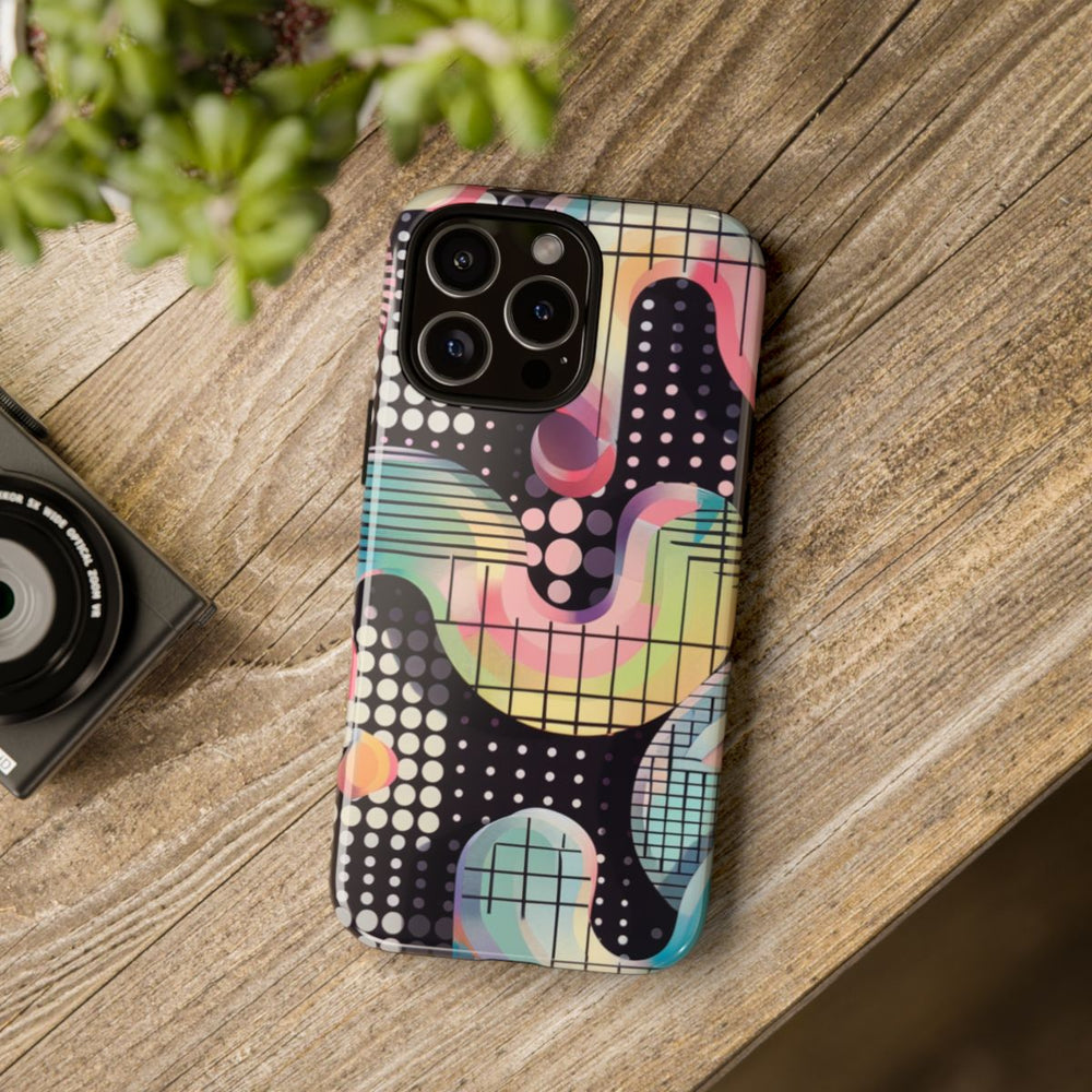 Dit telefoonhoesje heeft een levendig, abstract geometrisch patroon met vloeiende, golvende vormen in pastelkleuren zoals roze, blauw, geel en groen. De zwarte achtergrond is versierd met een raster van witte en lichtgekleurde stippen. Sommige vormen zijn voorzien van fijne zwarte rasterlijnen, wat extra diepte en detail geeft aan het ontwerp. Het hoesje is glanzend en stevig, gemaakt van polycarbonaat met een TPU-voering voor dubbele bescherming. Ondersteunt draadloos opladen.