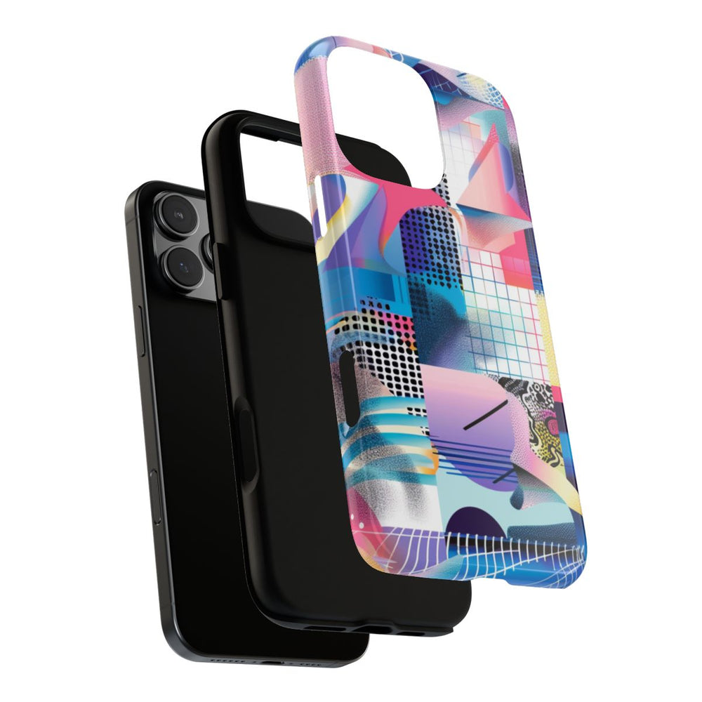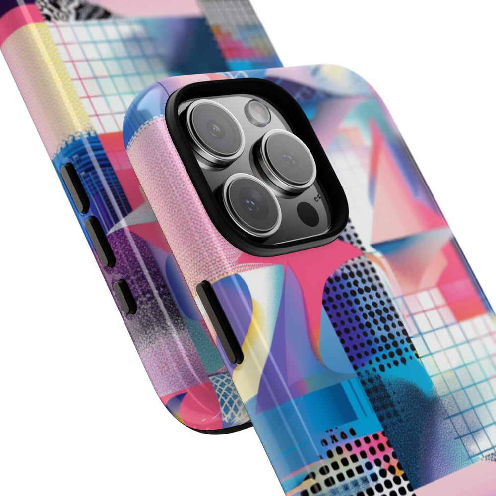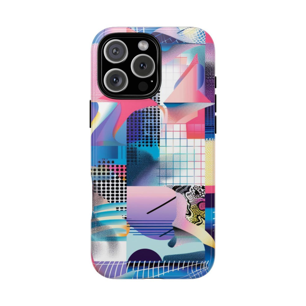 Dit telefoonhoesje is voorzien van een levendig abstract geometrisch patroon met diverse vormen zoals vierkanten, stippen, rasters en gebogen lijnen. De kleurencombinatie bestaat uit heldere tinten roze, blauw, paars, geel en zwarte accenten. Het patroon oogt speels en gelaagd, waardoor er diepte en beweging ontstaat. Het hoesje heeft een glanzende afwerking en is extra stevig dankzij de dubbele laag van een polycarbonaat buitenkant en een TPU-binnenzijde. Dit zorgt voor optimale bescherming en ondersteuning van draadloos opladen.