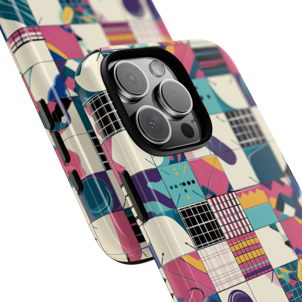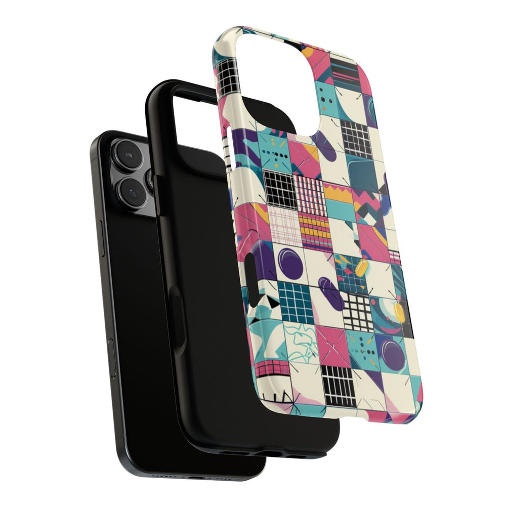 Dit hoesje heeft een opvallend abstract geometrisch patroon, opgebouwd uit kleine vierkante tegels die in een raster zijn gerangschikt. In het ontwerp komen diverse vormen voor, zoals cirkels, lijnen, rasters en golven, in een speelse mix van kleuren zoals teal, roze, paars, zwart, geel en crème. Het geheel straalt een moderne, artistieke sfeer uit door de combinatie van effen en getextureerde elementen. Het hoesje is glanzend afgewerkt en bestaat uit twee lagen voor extra stevigheid en bescherming. Geschikt voor draadloos opladen.