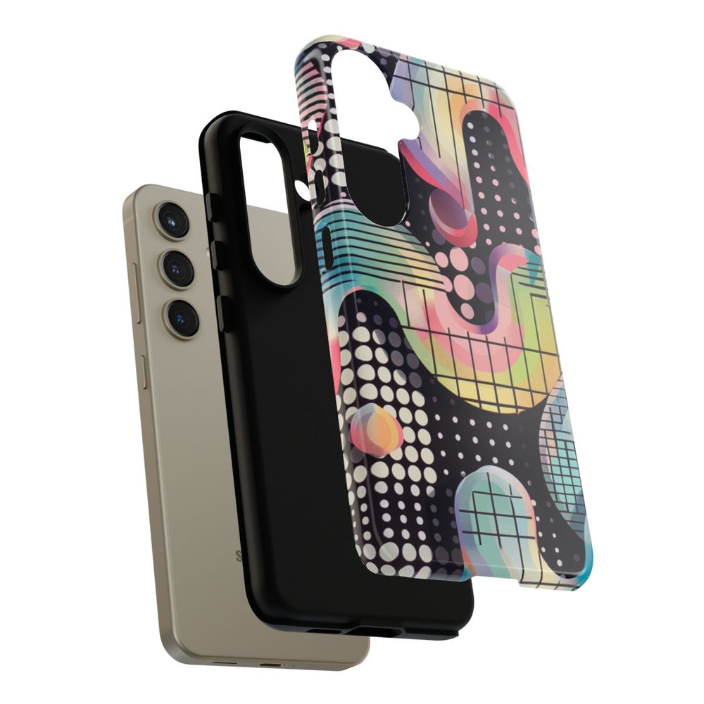 Dit telefoonhoesje heeft een levendig, abstract geometrisch patroon met vloeiende, golvende vormen in pastelkleuren zoals roze, blauw, geel en groen. De zwarte achtergrond is versierd met een raster van witte en lichtgekleurde stippen. Sommige vormen zijn voorzien van fijne zwarte rasterlijnen, wat extra diepte en detail geeft aan het ontwerp. Het hoesje is glanzend en stevig, gemaakt van polycarbonaat met een TPU-voering voor dubbele bescherming. Ondersteunt draadloos opladen.