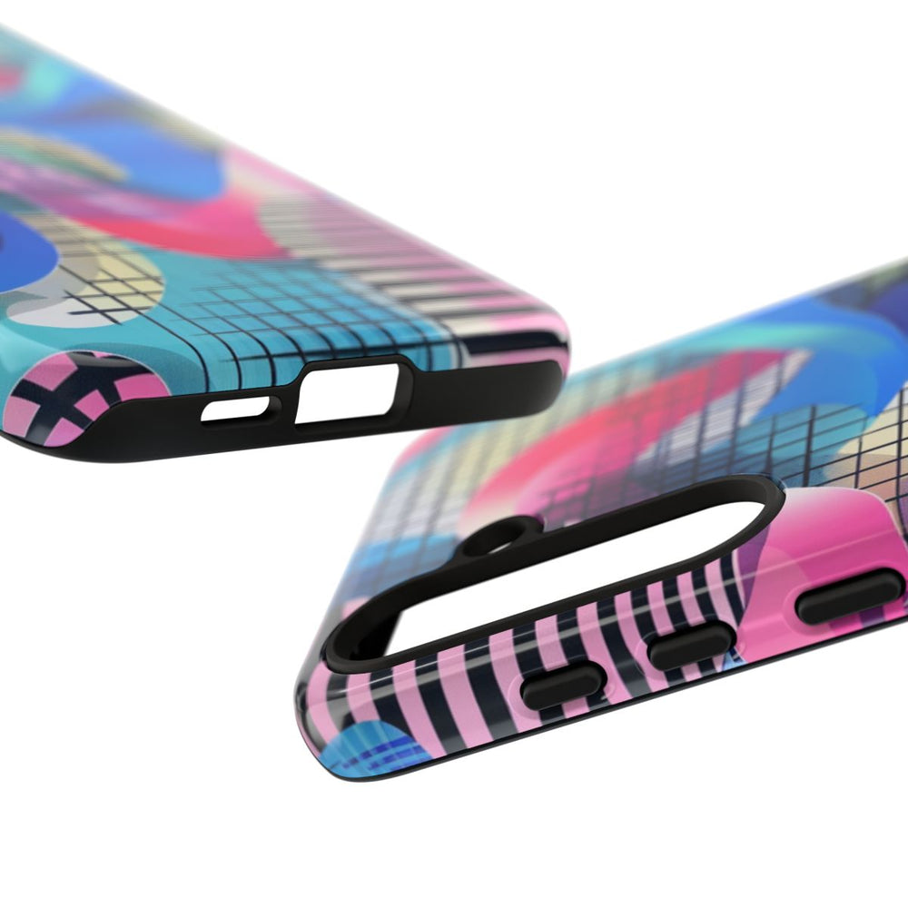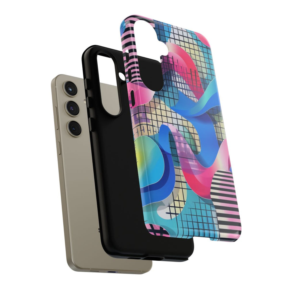 Dit telefoonhoesje heeft een abstract geometrisch patroon met een levendig kleurenpalet waarin blauwtinten, roze, geel en zwart de boventoon voeren. Het ontwerp bestaat uit verschillende vormen zoals cirkels, golvende linten en onregelmatige figuren die zijn opgevuld met strepen en rasterlijnen. De overlappende elementen zorgen voor een dynamisch, gelaagd effect en geven het hoesje een moderne, artistieke uitstraling. Het hoesje is gemaakt van polycarbonaat en TPU, heeft een glanzende afwerking en biedt stevige bescherming. Geschikt voor draadloos opladen.