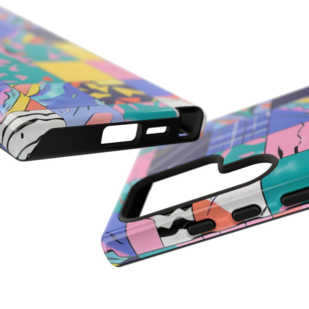 Dit telefoonhoesje heeft een levendig tegelpatroon met verschillende abstracte geometrische vormen en lijnen. Het ontwerp bestaat uit blokken roze, turquoise, geel, blauw en koraal, aangevuld met zwarte en witte accenten. De vormen variëren van golvende lijnen tot rasterstructuren en onregelmatige figuren, wat zorgt voor een dynamisch en modern effect. Het patroon is gedrukt op een glanzend, stevig hoesje van duurzaam polycarbonaat met een TPU-voering, dat optimale bescherming biedt en geschikt is voor draadloos opladen.