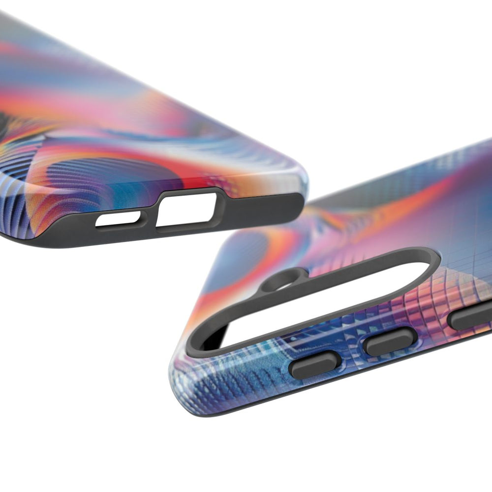 Dit hoesje heeft een verfijnd abstract geometrisch patroon met een levendige mix van kleuren zoals blauw, roze, rood, oranje en wit. Het ontwerp bevat rasterachtige structuren en vloeiende vormen die zorgen voor diepte en dynamiek. De afbeelding heeft een glanzende afwerking en het stevige hoesje is gemaakt van duurzaam polycarbonaat met een TPU-voering, wat optimale bescherming biedt en draadloos opladen ondersteunt. De heldere kleuren en complexe vormen geven het hoesje een moderne, artistieke uitstraling.