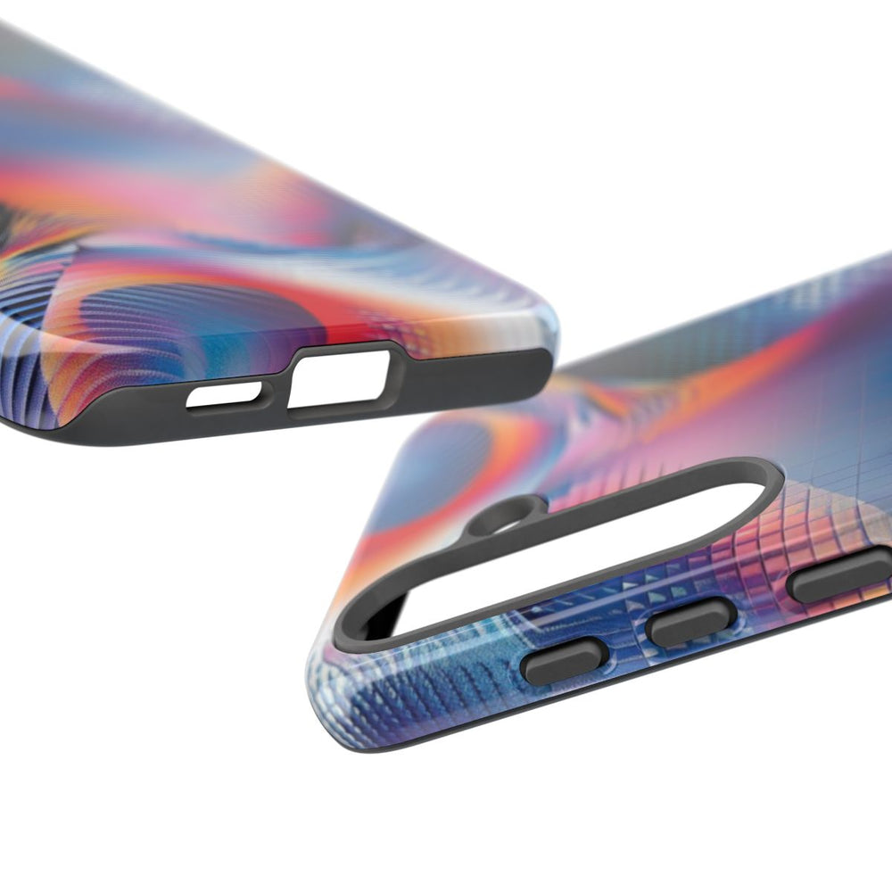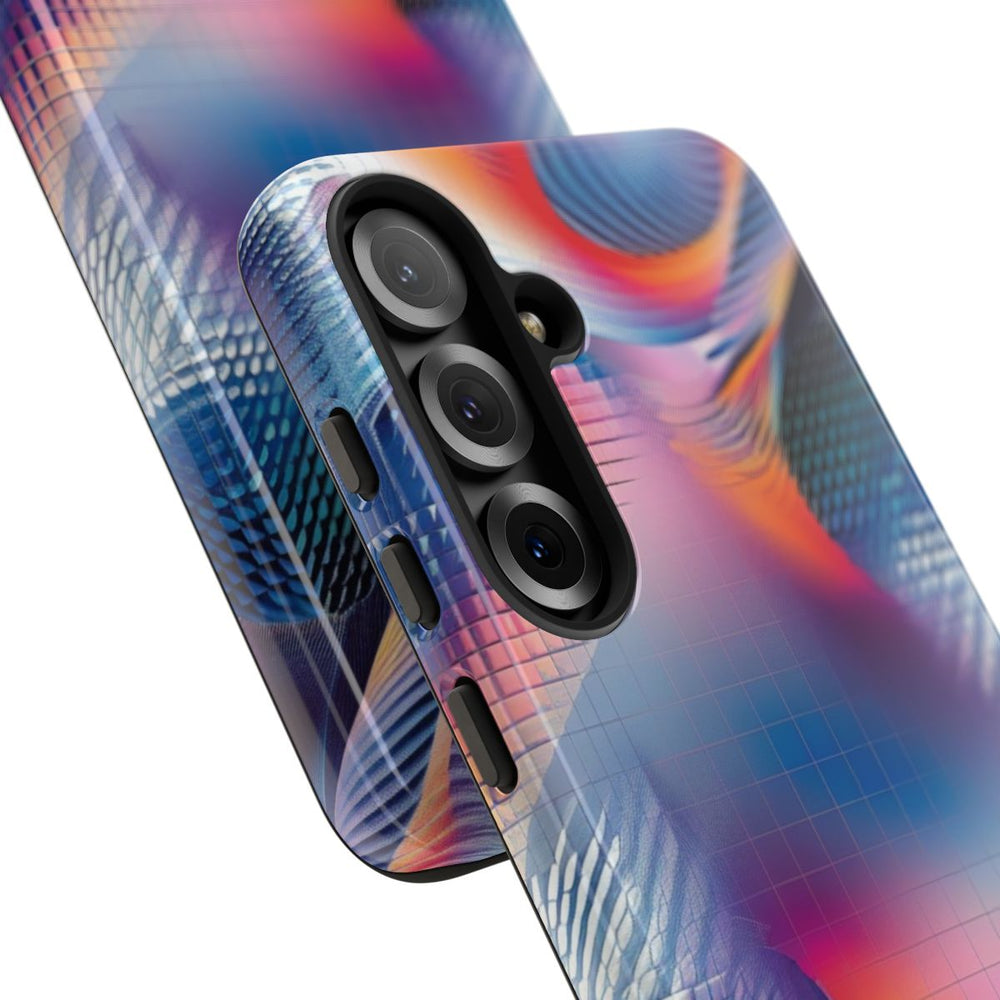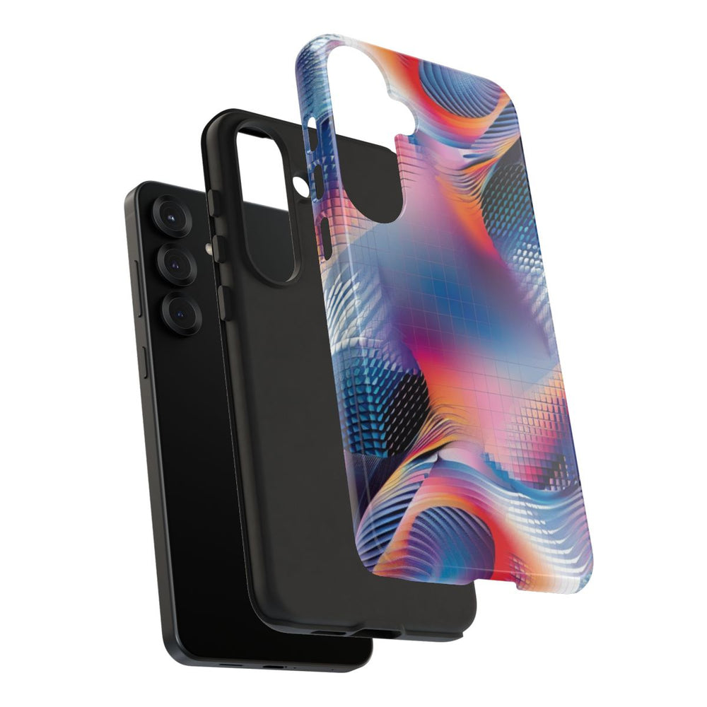 Dit hoesje heeft een verfijnd abstract geometrisch patroon met een levendige mix van kleuren zoals blauw, roze, rood, oranje en wit. Het ontwerp bevat rasterachtige structuren en vloeiende vormen die zorgen voor diepte en dynamiek. De afbeelding heeft een glanzende afwerking en het stevige hoesje is gemaakt van duurzaam polycarbonaat met een TPU-voering, wat optimale bescherming biedt en draadloos opladen ondersteunt. De heldere kleuren en complexe vormen geven het hoesje een moderne, artistieke uitstraling.