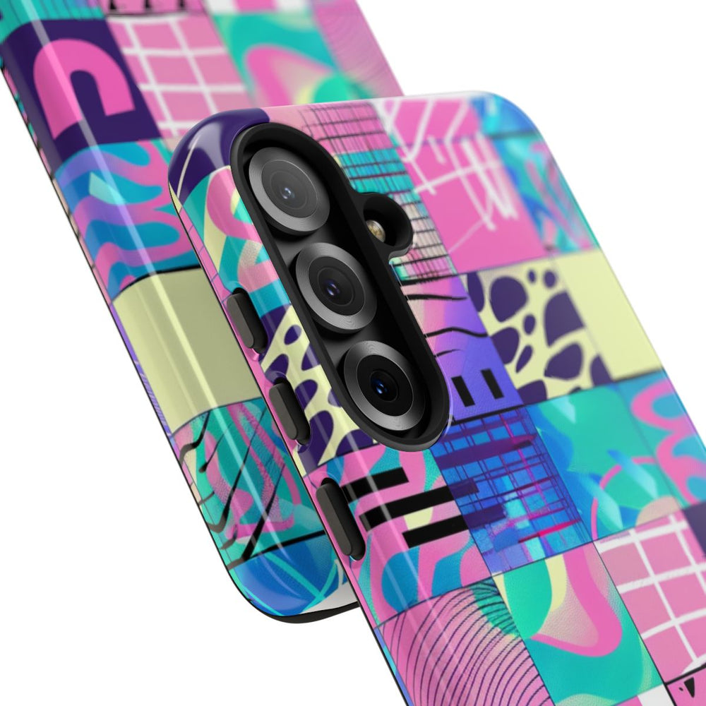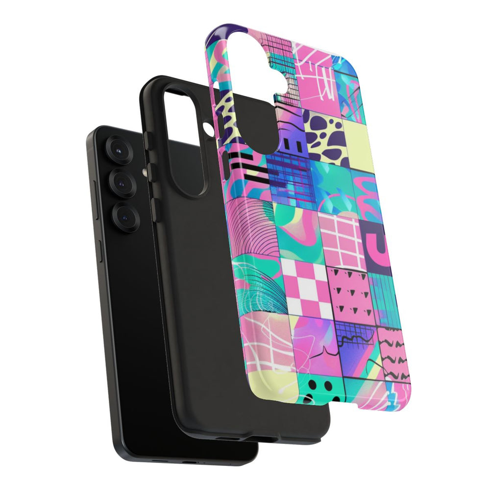 Dit hoesje heeft een levendig en kleurrijk abstract geometrisch patroon, opgebouwd uit kleine vierkante tegels die in een raster zijn gerangschikt. Elke tegel bevat unieke vormen, lijnen en patronen zoals golven, rasters, stippen en organische motieven. De kleurstelling bestaat uit heldere tinten turquoise, roze, paars en geel, met zwarte accenten. Dit zorgt voor een speels en dynamisch visueel effect. Het hoesje is glanzend en extra stevig dankzij de dubbele laag, met een buitenkant van polycarbonaat en een TPU-binnenzijde. Ondersteunt draadloos opladen.