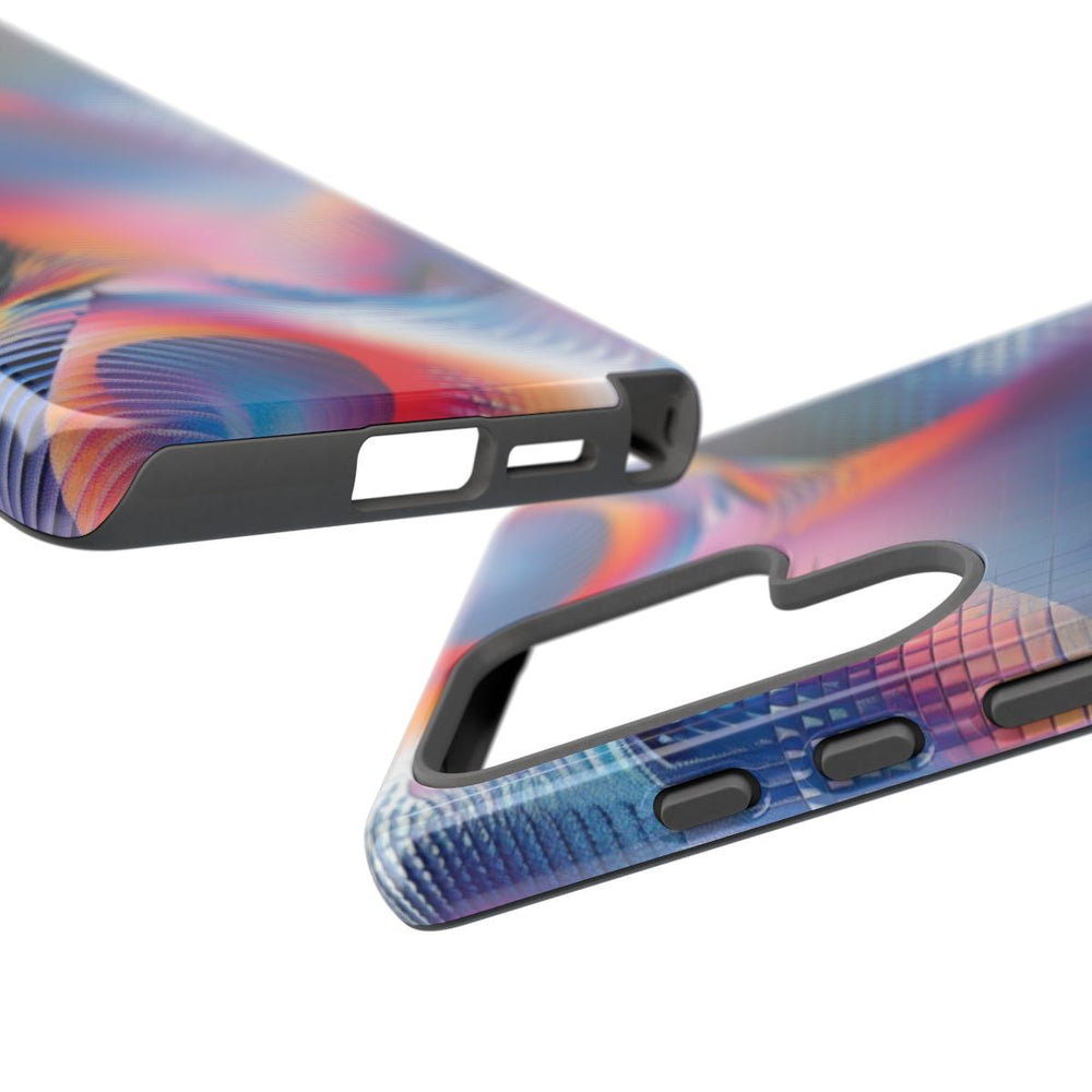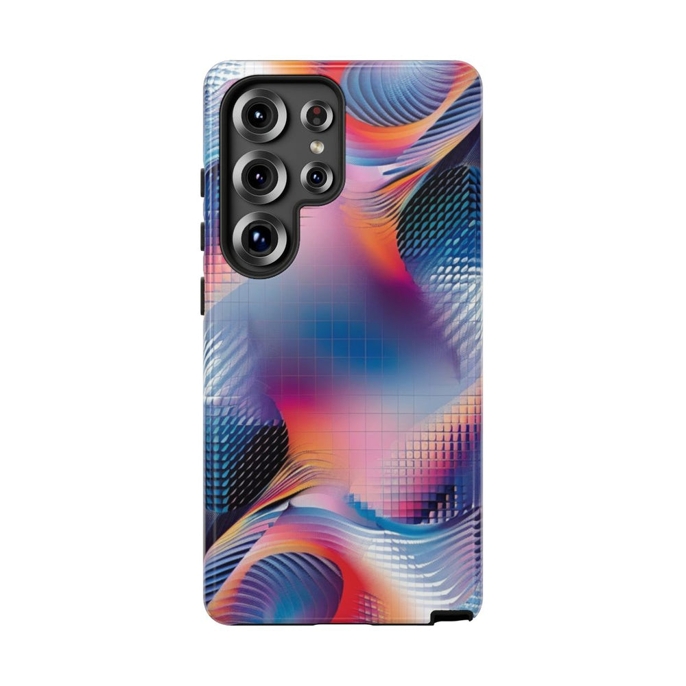 Dit hoesje heeft een verfijnd abstract geometrisch patroon met een levendige mix van kleuren zoals blauw, roze, rood, oranje en wit. Het ontwerp bevat rasterachtige structuren en vloeiende vormen die zorgen voor diepte en dynamiek. De afbeelding heeft een glanzende afwerking en het stevige hoesje is gemaakt van duurzaam polycarbonaat met een TPU-voering, wat optimale bescherming biedt en draadloos opladen ondersteunt. De heldere kleuren en complexe vormen geven het hoesje een moderne, artistieke uitstraling.