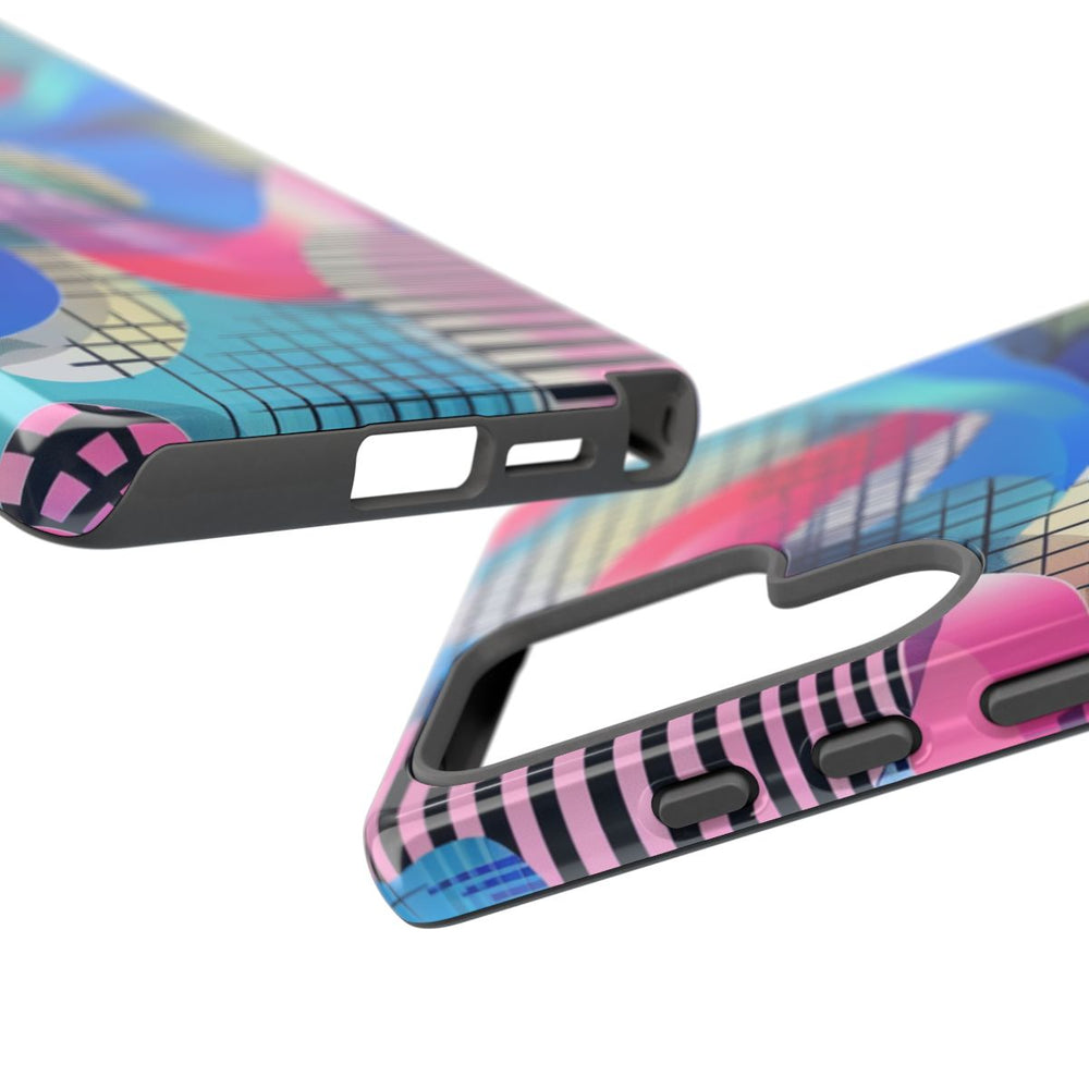 Dit telefoonhoesje heeft een abstract geometrisch patroon met een levendig kleurenpalet waarin blauwtinten, roze, geel en zwart de boventoon voeren. Het ontwerp bestaat uit verschillende vormen zoals cirkels, golvende linten en onregelmatige figuren die zijn opgevuld met strepen en rasterlijnen. De overlappende elementen zorgen voor een dynamisch, gelaagd effect en geven het hoesje een moderne, artistieke uitstraling. Het hoesje is gemaakt van polycarbonaat en TPU, heeft een glanzende afwerking en biedt stevige bescherming. Geschikt voor draadloos opladen.