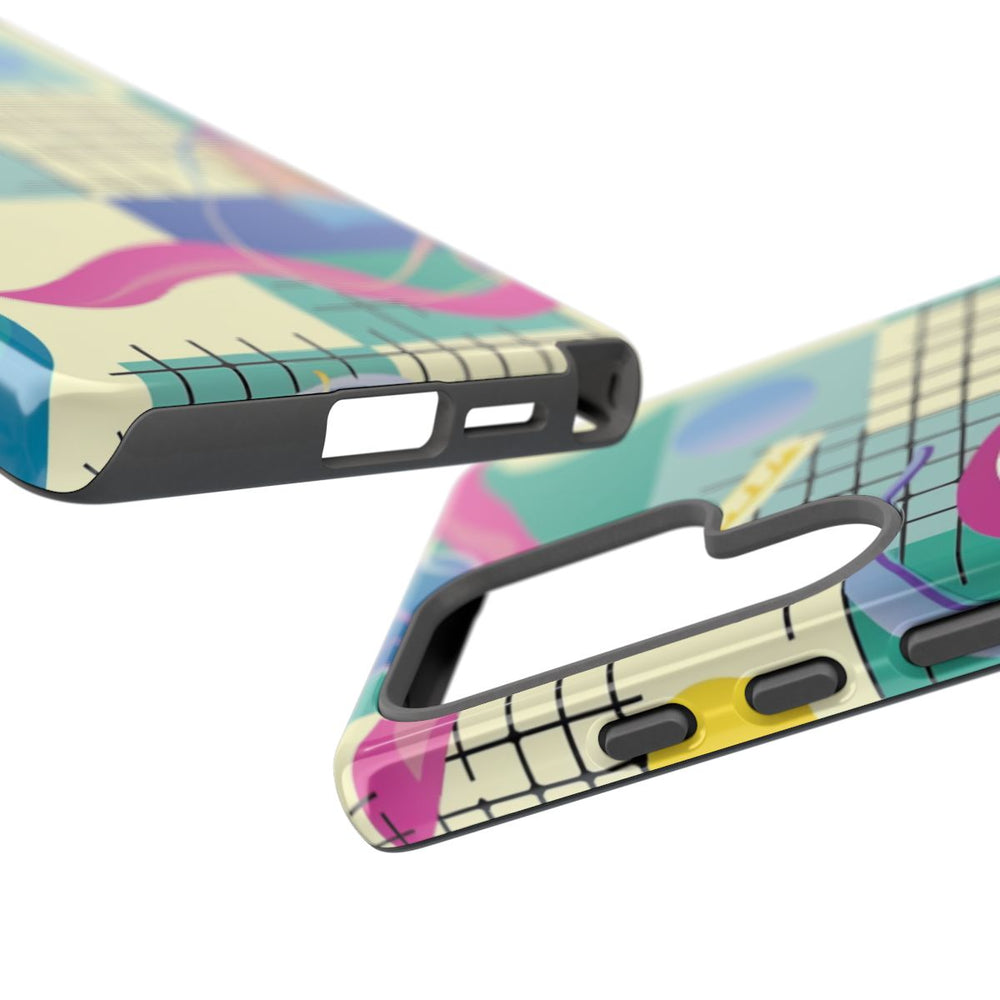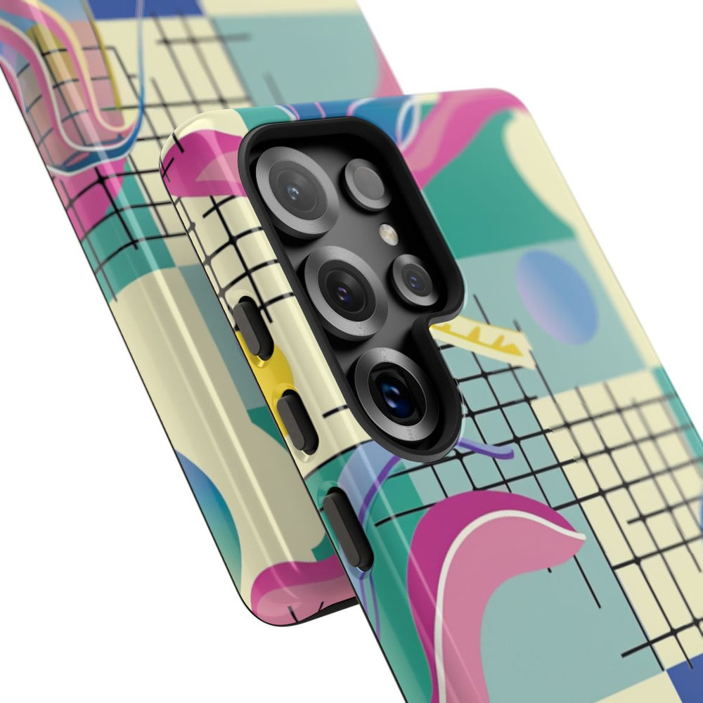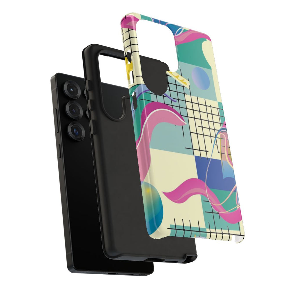 Dit telefoonhoesje heeft een opvallend abstract geometrisch ontwerp met een speelse mix van vormen en kleuren. Je ziet onder andere blauwe en gele bollen, roze en paarse linten en zwarte rasterlijnen op een achtergrond van crème, blauwgroene en blauwe vlakken. Het patroon is dynamisch en levendig, met een combinatie van vloeiende lijnen en strakke rasters. Het hoesje heeft een glanzende afwerking en bestaat uit een stevige dubbele laag van een polycarbonaat buitenkant en een TPU-binnenzijde. Dit zorgt voor extra stevigheid en bescherming, terwijl draadloos opladen gewoon mogelijk blijft.
