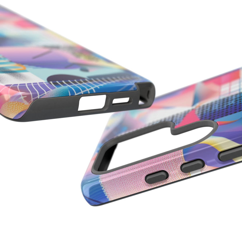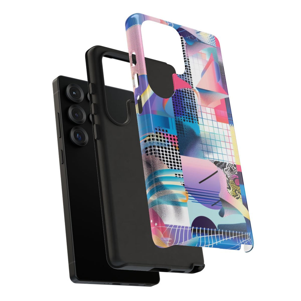 Dit telefoonhoesje is voorzien van een levendig abstract geometrisch patroon met diverse vormen zoals vierkanten, stippen, rasters en gebogen lijnen. De kleurencombinatie bestaat uit heldere tinten roze, blauw, paars, geel en zwarte accenten. Het patroon oogt speels en gelaagd, waardoor er diepte en beweging ontstaat. Het hoesje heeft een glanzende afwerking en is extra stevig dankzij de dubbele laag van een polycarbonaat buitenkant en een TPU-binnenzijde. Dit zorgt voor optimale bescherming en ondersteuning van draadloos opladen.