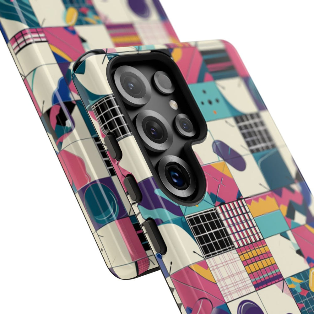 Dit hoesje heeft een opvallend abstract geometrisch patroon, opgebouwd uit kleine vierkante tegels die in een raster zijn gerangschikt. In het ontwerp komen diverse vormen voor, zoals cirkels, lijnen, rasters en golven, in een speelse mix van kleuren zoals teal, roze, paars, zwart, geel en crème. Het geheel straalt een moderne, artistieke sfeer uit door de combinatie van effen en getextureerde elementen. Het hoesje is glanzend afgewerkt en bestaat uit twee lagen voor extra stevigheid en bescherming. Geschikt voor draadloos opladen.