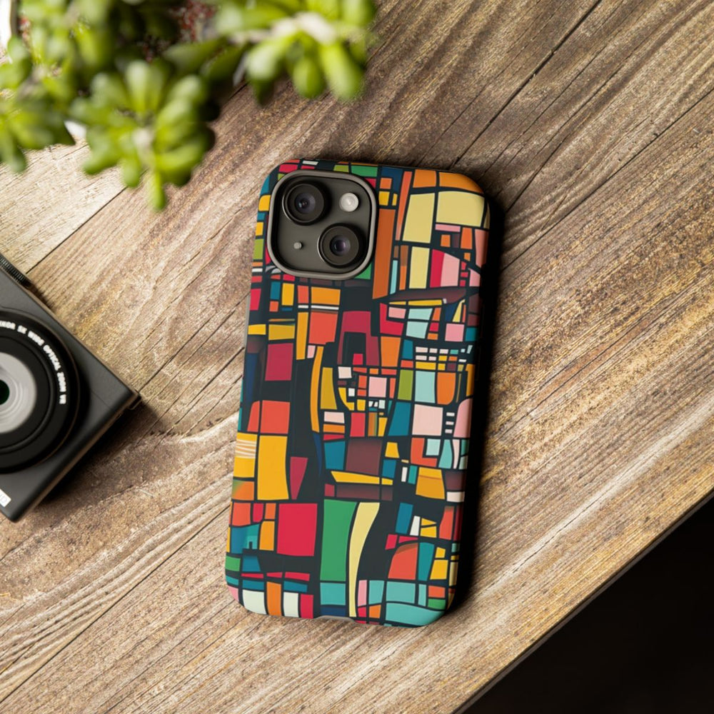 Dit telefoonhoesje heeft een levendig, abstract geometrisch patroon met diverse rechthoekige en vierkante vormen in verschillende kleuren. De vormen zijn omlijnd met zwart, wat zorgt voor een glas-in-lood effect. De hoofdkleuren zijn onder andere rood, oranje, geel, groen, turquoise en blauw. Het patroon is modern en gedetailleerd en bedekt het volledige matte hoesje. Het hoesje is gemaakt van polycarbonaat en TPU, wat zorgt voor stevigheid en optimale bescherming. Geschikt voor draadloos opladen en ideaal voor gebruik buitenshuis.