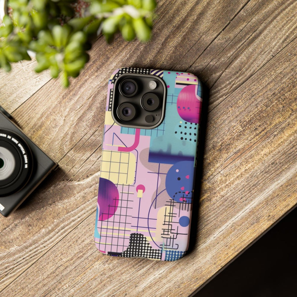Dit hoesje heeft een levendig abstract geometrisch patroon met diverse vormen zoals cirkels, rasters, stippen en lijnen. De kleurencombinatie bestaat uit tinten blauw, roze, paars, zwart en crème, wat zorgt voor een dynamisch en opvallend geheel. Door de verschillende lagen, texturen en vormen krijgt het patroon extra diepte en karakter. Het ontwerp is bedrukt op een mat hoesje van polycarbonaat en TPU, dat bestaat uit twee lagen voor optimale bescherming en geschikt is voor draadloos opladen.