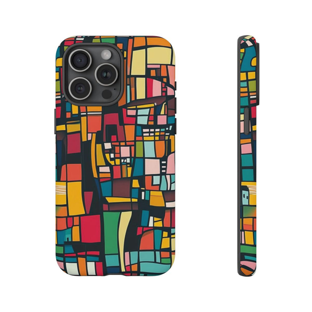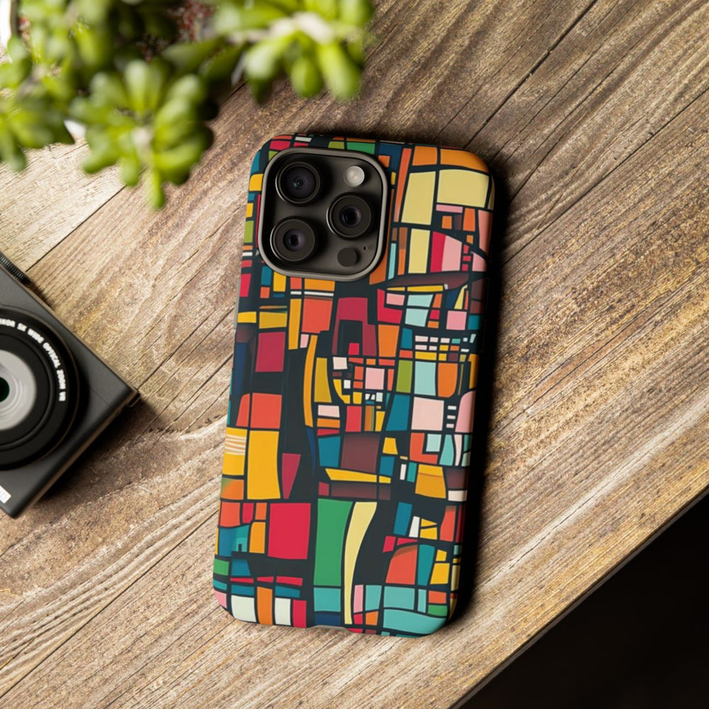 Dit telefoonhoesje is voorzien van een opvallend abstract geometrisch patroon met diverse rechthoekige en vierkante vormen in verschillende kleuren. De vormen zijn omlijnd met zwarte lijnen, wat zorgt voor een glas-in-lood effect. Het kleurenpalet bestaat uit tinten rood, oranje, geel, groen, blauw en crème. Het patroon is levendig en dynamisch en bedekt de volledige hoes. Het stevige hoesje is gemaakt van polycarbonaat en TPU, biedt uitstekende bescherming en ondersteunt draadloos opladen.