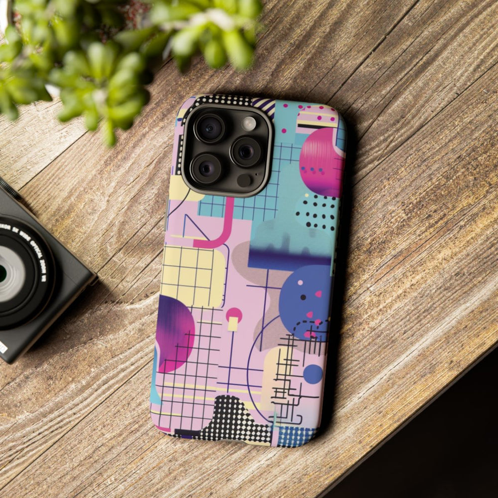 Dit hoesje heeft een levendig abstract geometrisch patroon met diverse vormen zoals cirkels, rasters, stippen en lijnen. De kleurencombinatie bestaat uit tinten blauw, roze, paars, zwart en crème, wat zorgt voor een dynamisch en opvallend geheel. Door de verschillende lagen, texturen en vormen krijgt het patroon extra diepte en karakter. Het ontwerp is bedrukt op een mat hoesje van polycarbonaat en TPU, dat bestaat uit twee lagen voor optimale bescherming en geschikt is voor draadloos opladen.
